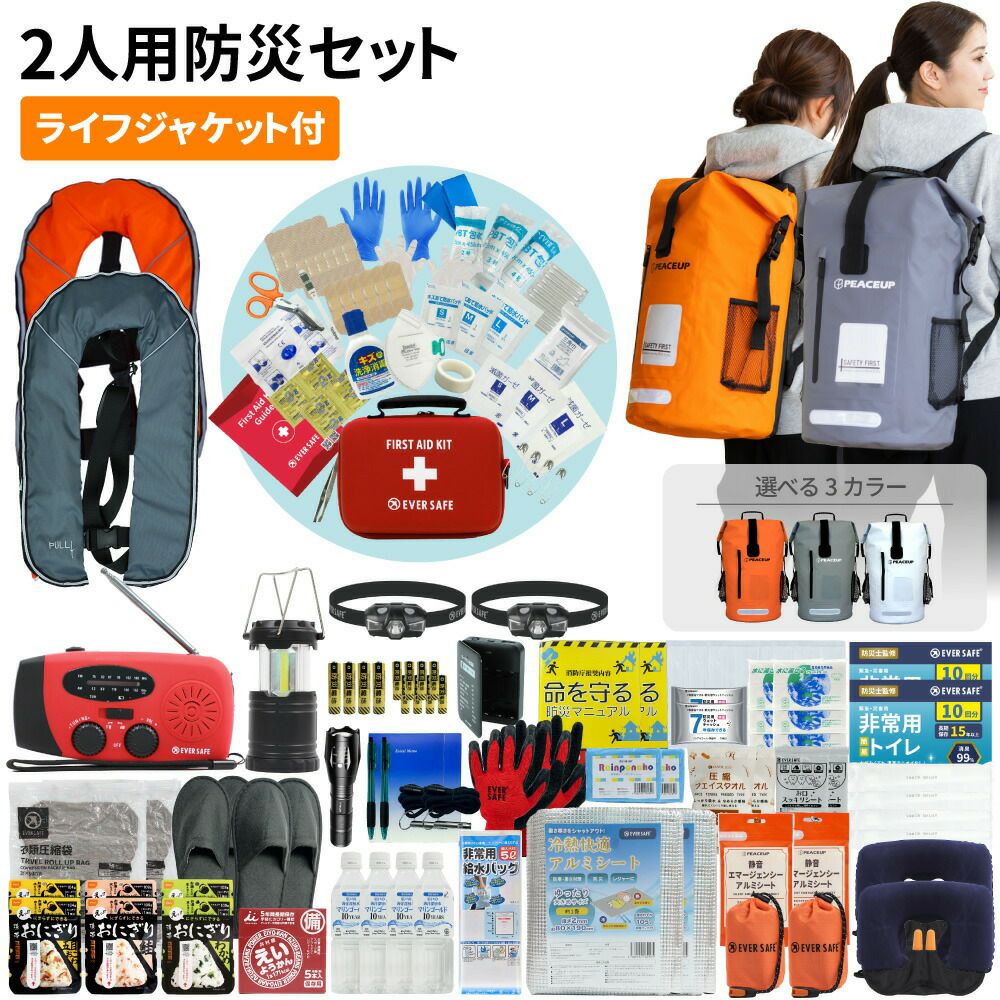 他の画像を見る 停電、断水、避難所生活などあらゆる場面を想定した万能タイプの防災セットに加え、ファーストエイドキットも付いたワンランク上の防災セット 防災グッズ 防災セット 2人用 ドライバッグ 防水リュック ヘッドライト ライフジャケット 防災士監修 ファーストエイドキット トイレ 非常食 避難グッズ 水害対策 ランタン 懐中電灯 警戒レベル5 EVERSAFE L5DRLF02 公式サイト販売価格 ¥ 40,659 税込 詳細を見る お気に入りに登録する