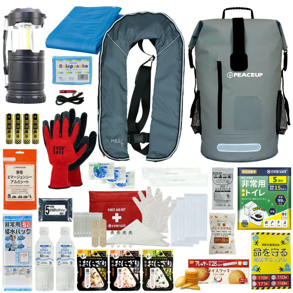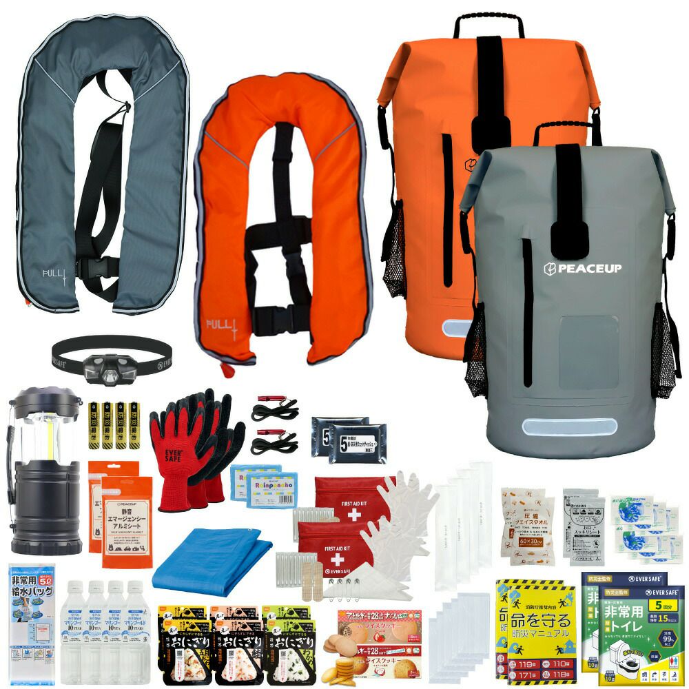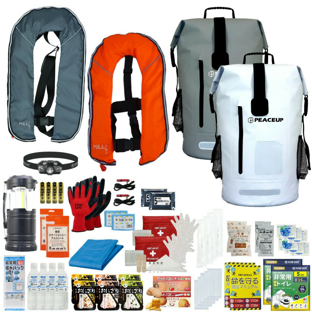 他の画像を見る ベストタイプのライフジャケット付き 水害に備える防災セット 水に強い防水リュック 防災士監修 防災セット 2人用 ドライバッグ 防水リュック 手動膨張式 ライフジャケット 水害対策 防災グッズ 非常食 保存水 ランタン 簡易トイレ 救急ポーチ 水難 アウトドア 警戒レベル3 PEACEUP L3DRLF02 公式サイト販売価格 ¥ 27,074 税込 詳細を見る お気に入りに登録する