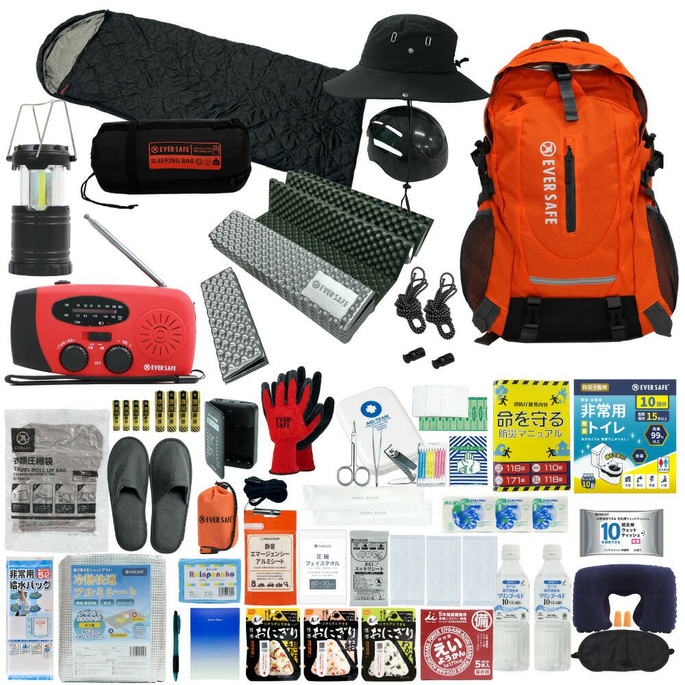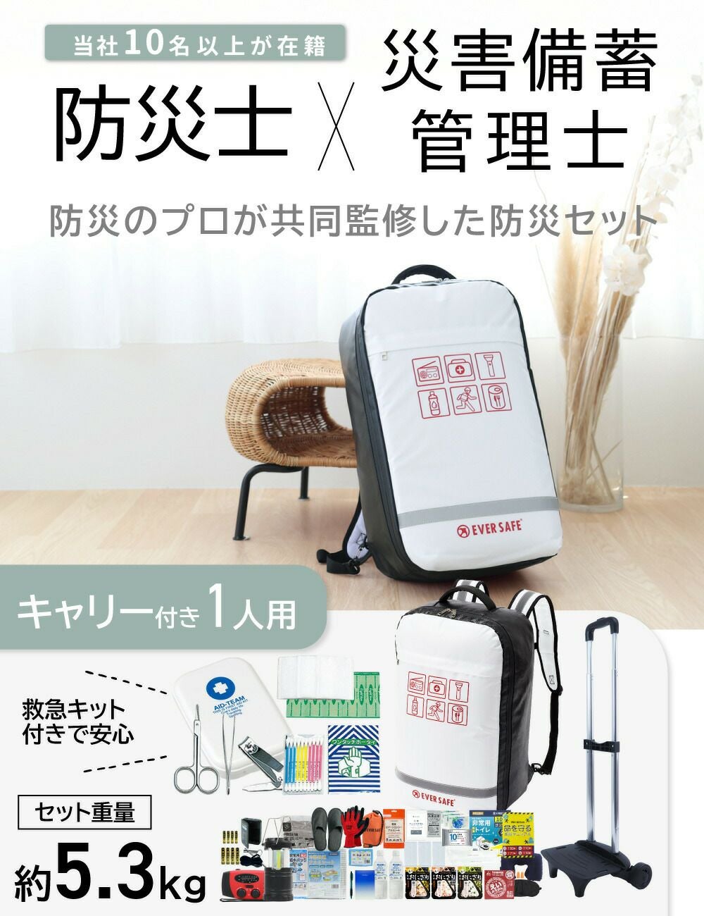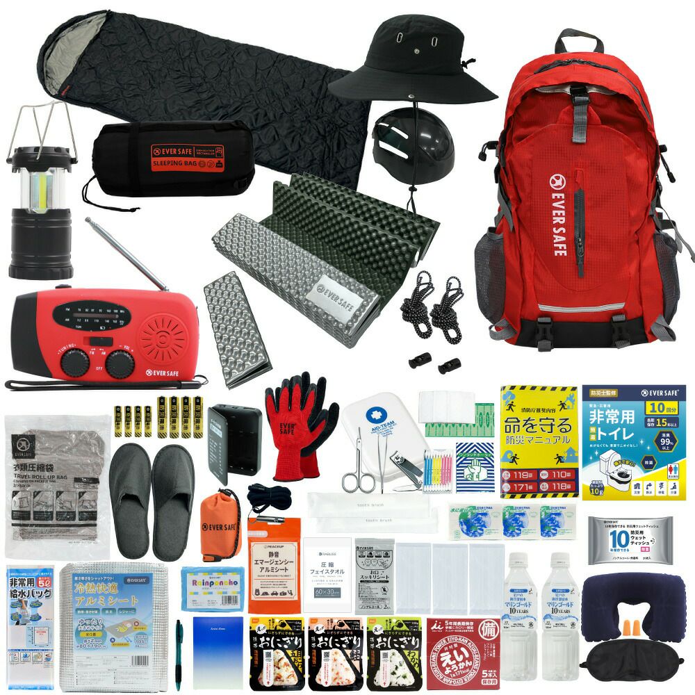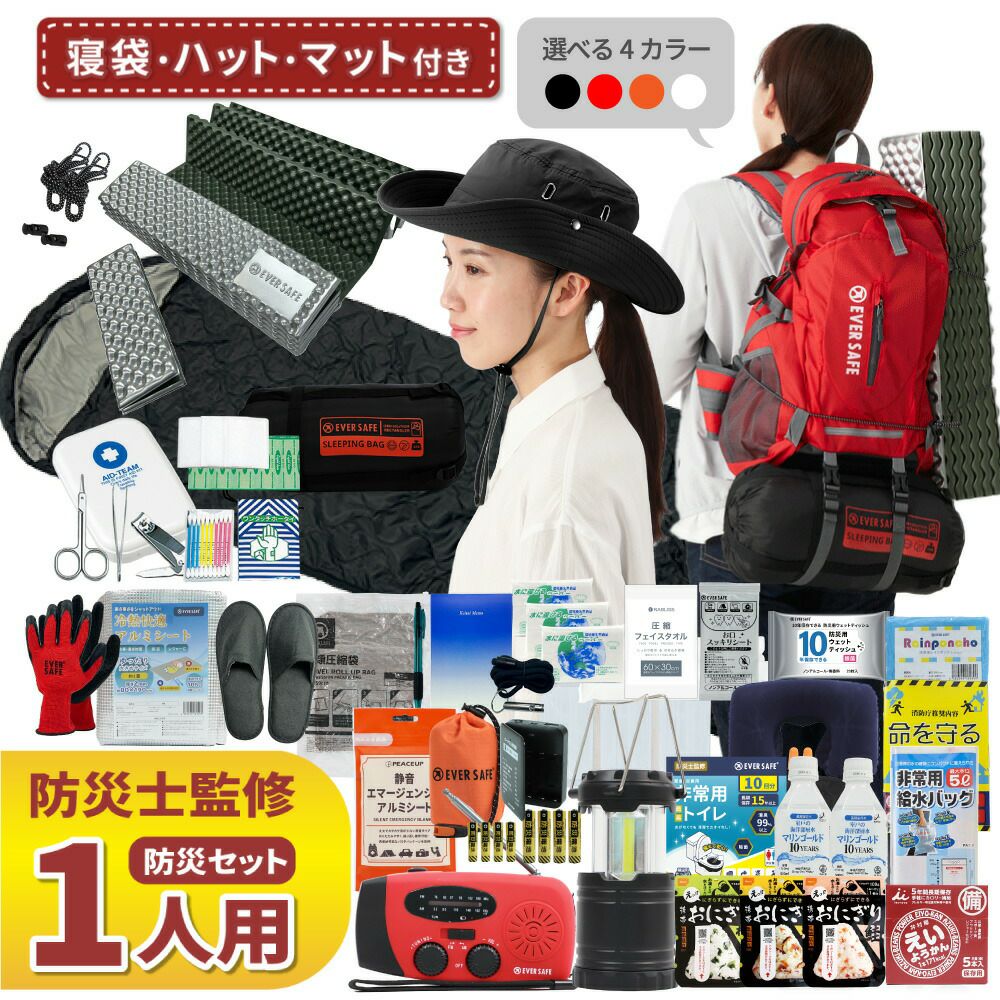 他の画像を見る ハット型ヘルメット・寝袋・マット付きの防災セット 機能性抜群の撥水加工済み防災リュック 防災士監修 防災セット 1人用 EVERSAFEリュック 寝袋 キャンプマット ハット型ヘルメット 防災リュック 撥水加工 非常食 保存水 防災ラジオ 簡易トイレ 救急セット 懐中電灯 衛生用品 警戒レベル4 超軽量 L4ESHTNBMT01 公式サイト特別価格 ¥ 23,655 税込 詳細を見る お気に入りに登録する