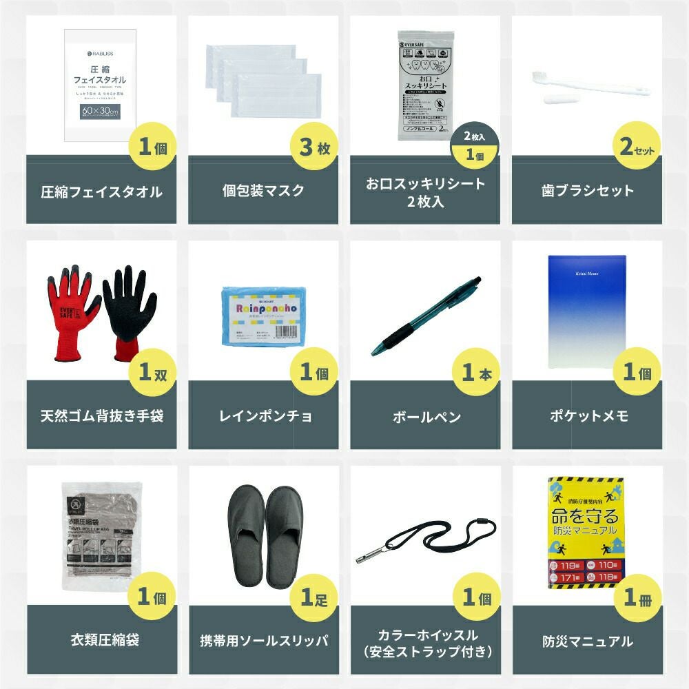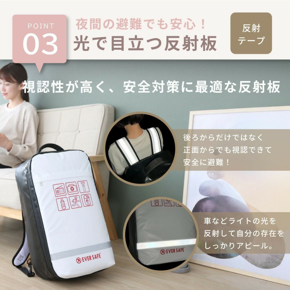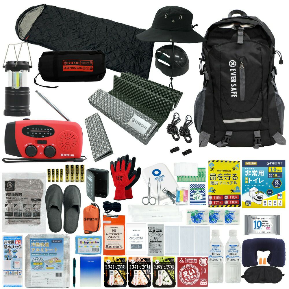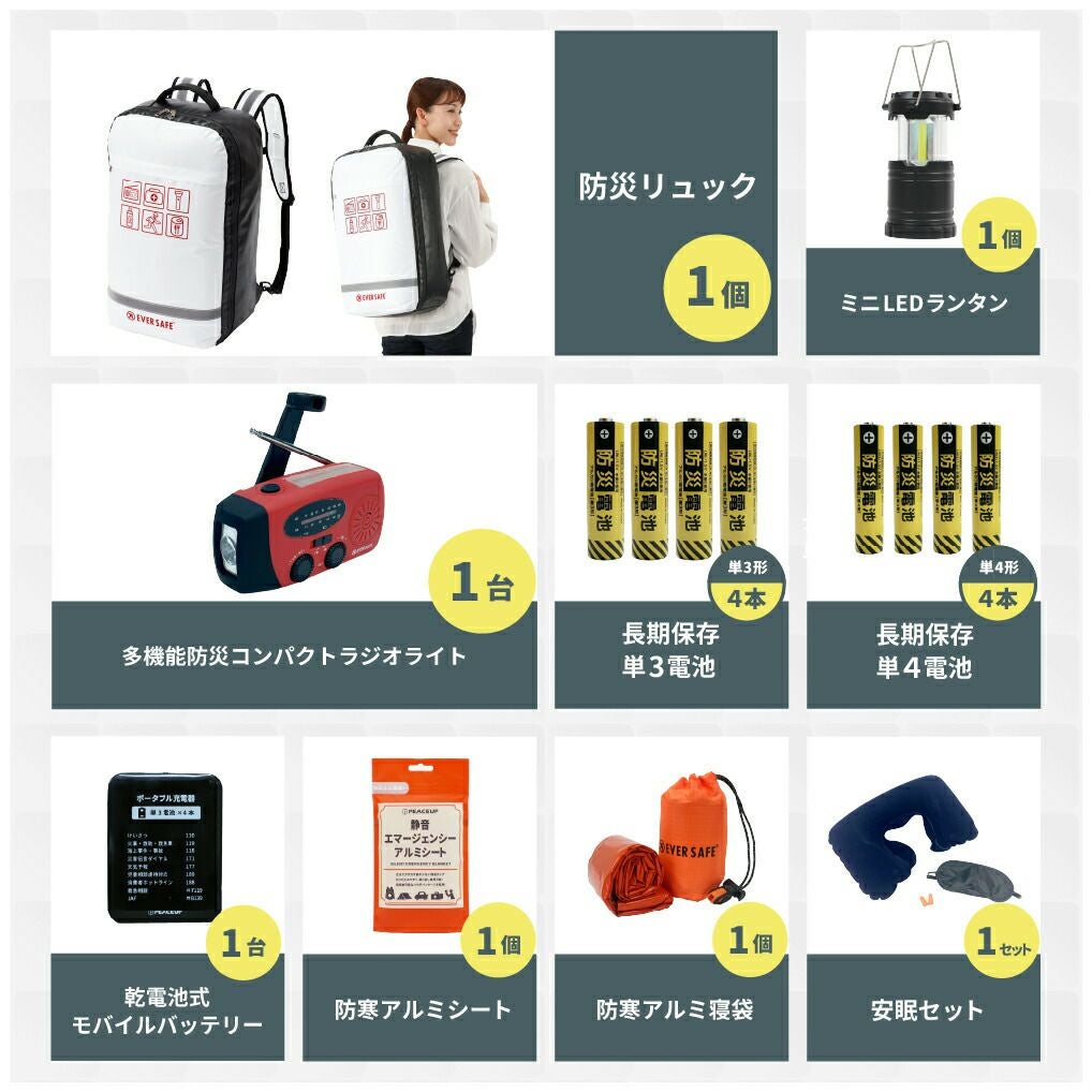 他の画像を見る ハット型ヘルメット・寝袋・マット付きの防災セット 機能性抜群の撥水加工済み防災リュック 防災士監修 防災セット 1人用 EVERSAFEリュック 寝袋 キャンプマット ハット型ヘルメット 防災リュック 撥水加工 非常食 保存水 防災ラジオ 簡易トイレ 救急セット 懐中電灯 衛生用品 警戒レベル4 超軽量 L4ESHTNBMT01 公式サイト特別価格 ¥ 23,655 税込 詳細を見る お気に入りに登録する
