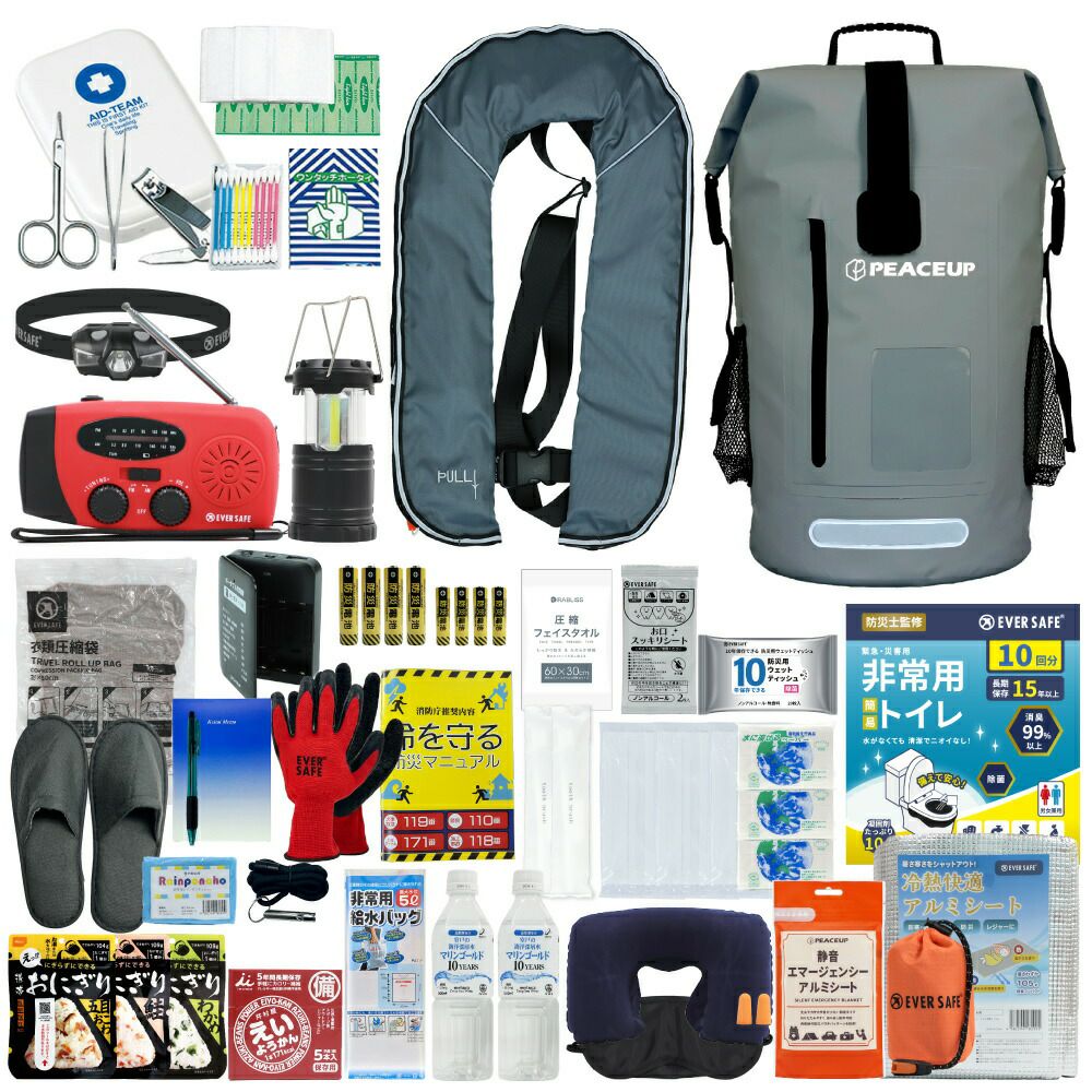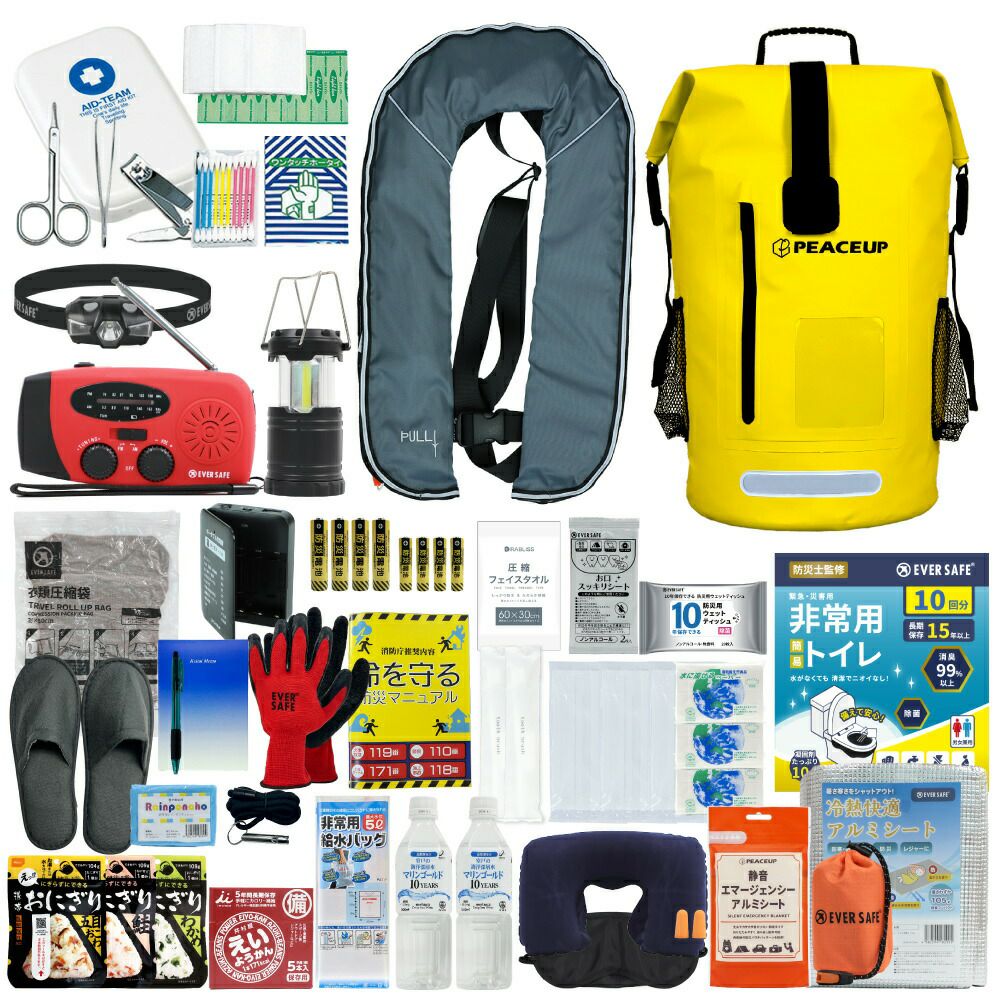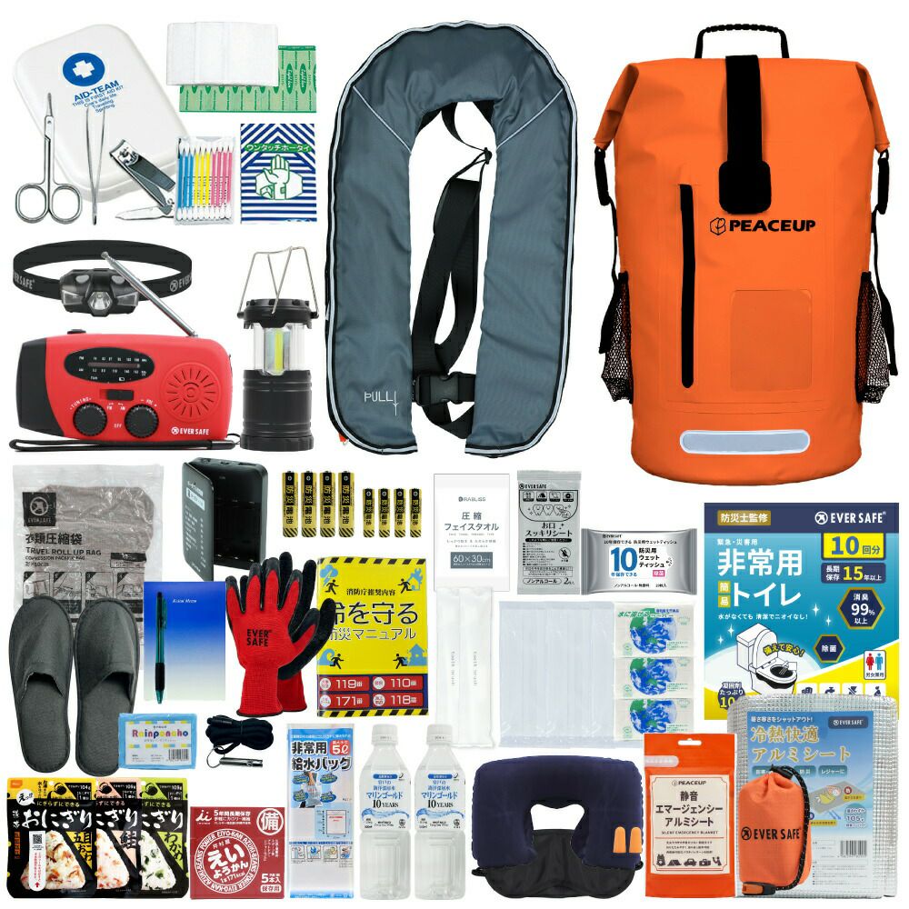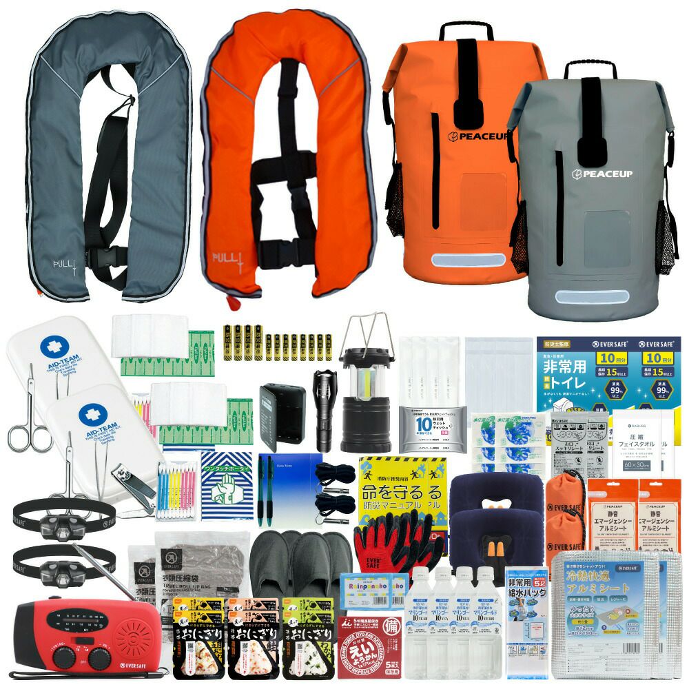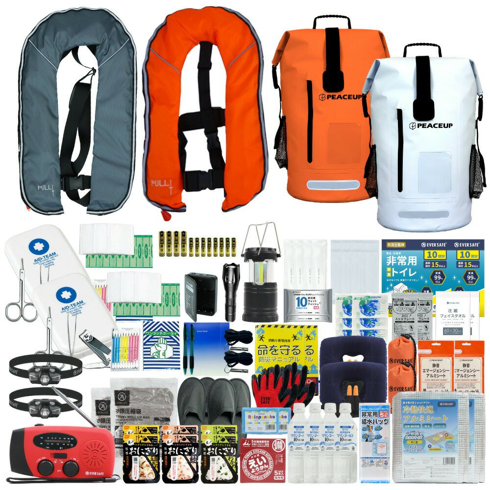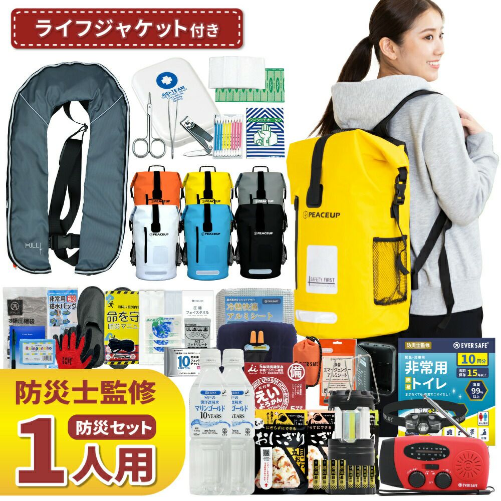 他の画像を見る 水に強い防水リュック ライフジャケット付き 水害に備える防災セット 選べる6カラー 防災士監修 防災セット 1人用 ドライバッグ 防水リュック 手動膨張式 ライフジャケット ヘッドライト 水害対策 防災リュック 非常食 保存水 防災ラジオ 簡易トイレ 懐中電灯 警戒レベル4 水難 アウトドア L4DRLF01 公式サイト特別価格 ¥ 22,610 税込 詳細を見る お気に入りに登録する