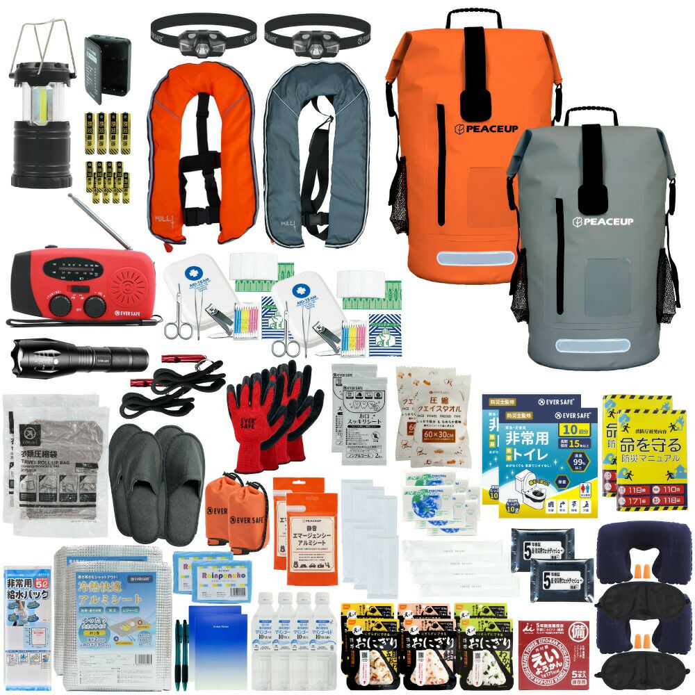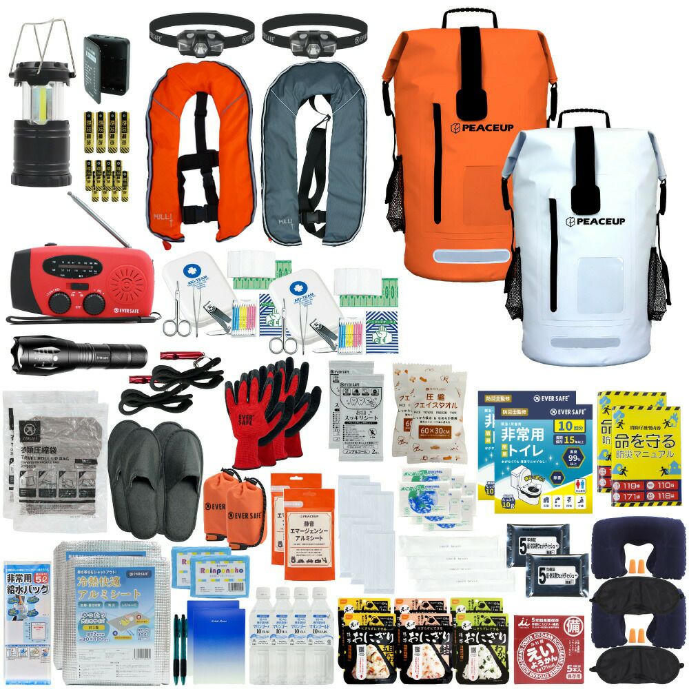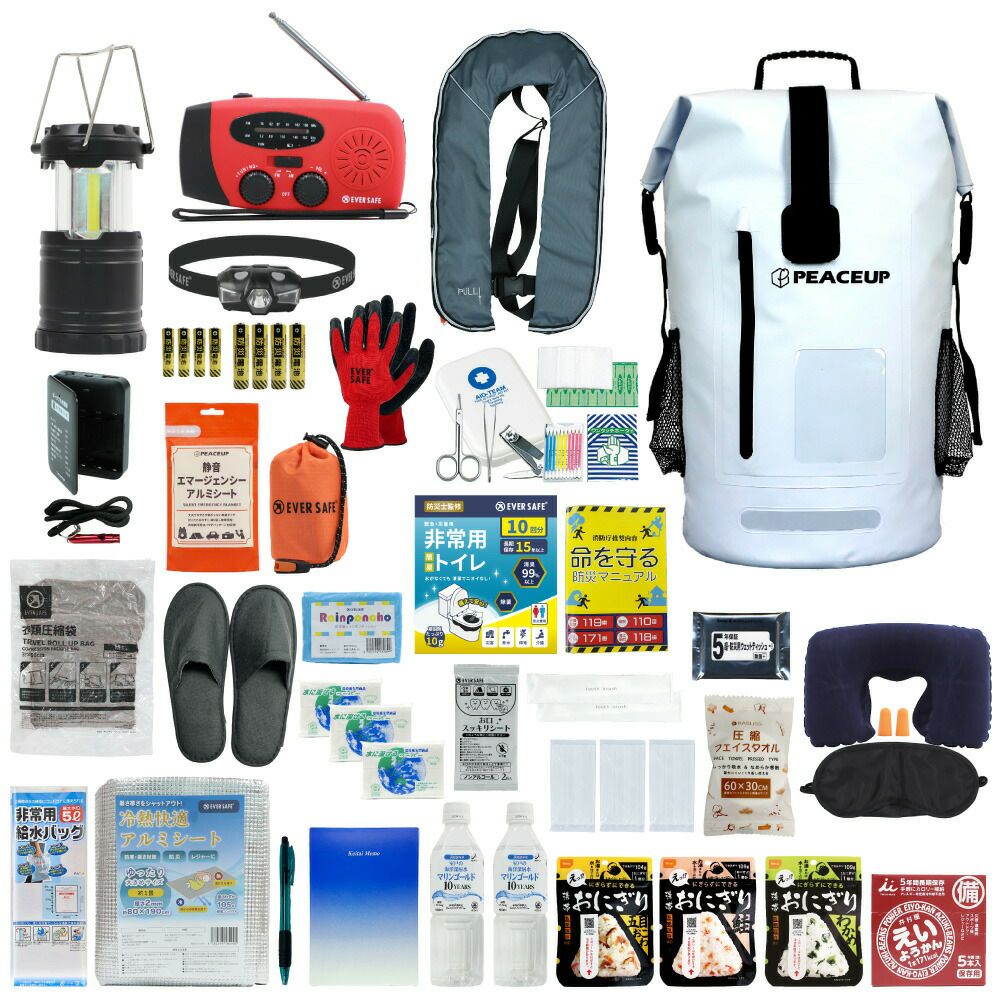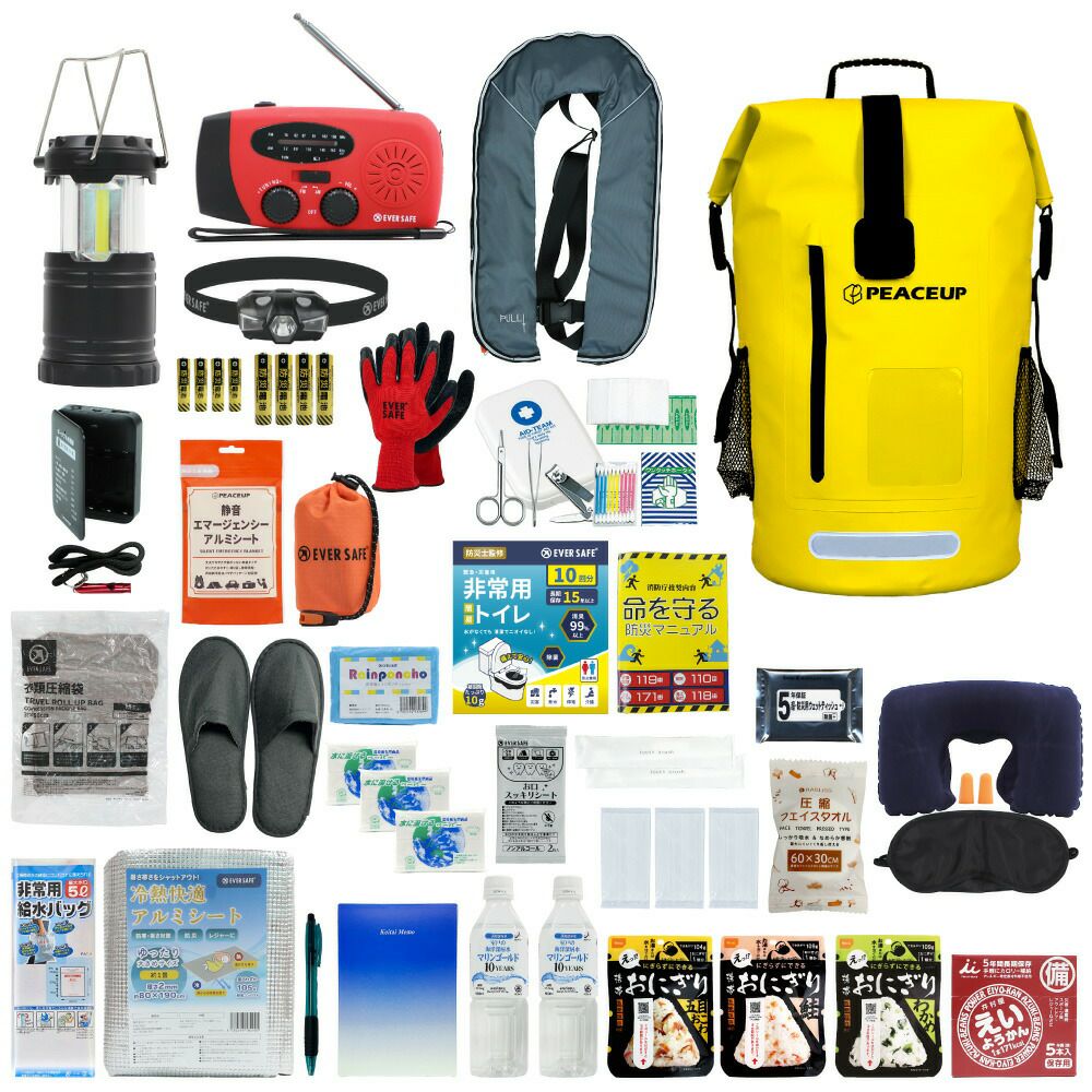 他の画像を見る 水に強い防水リュック ライフジャケット付き 水害に備える防災セット 選べる6カラー 防災士監修 防災セット 1人用 ドライバッグ 防水リュック 手動膨張式 ライフジャケット ヘッドライト 水害対策 防災リュック 非常食 保存水 防災ラジオ 簡易トイレ 懐中電灯 警戒レベル4 水難 アウトドア L4DRLF01 公式サイト販売価格 ¥ 22,610 税込 詳細を見る お気に入りに登録する