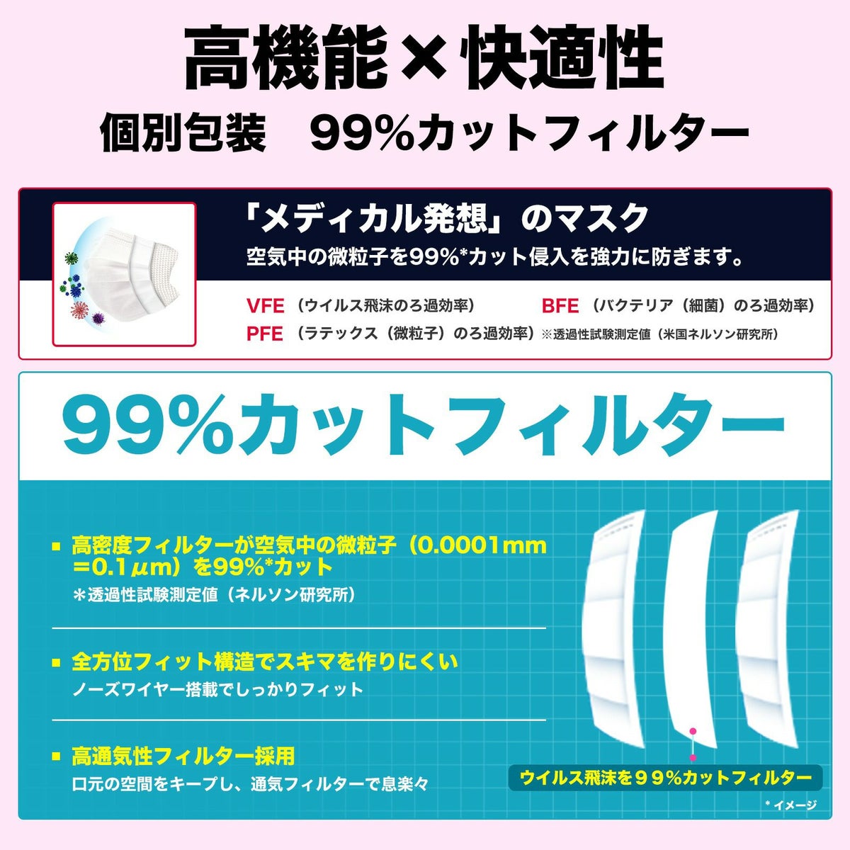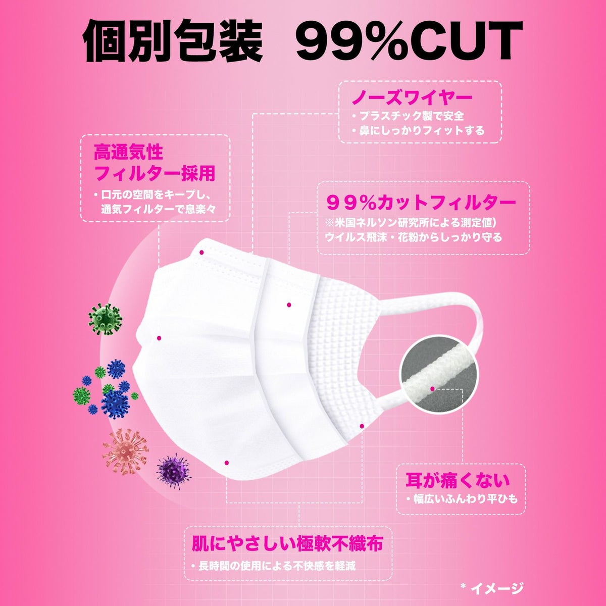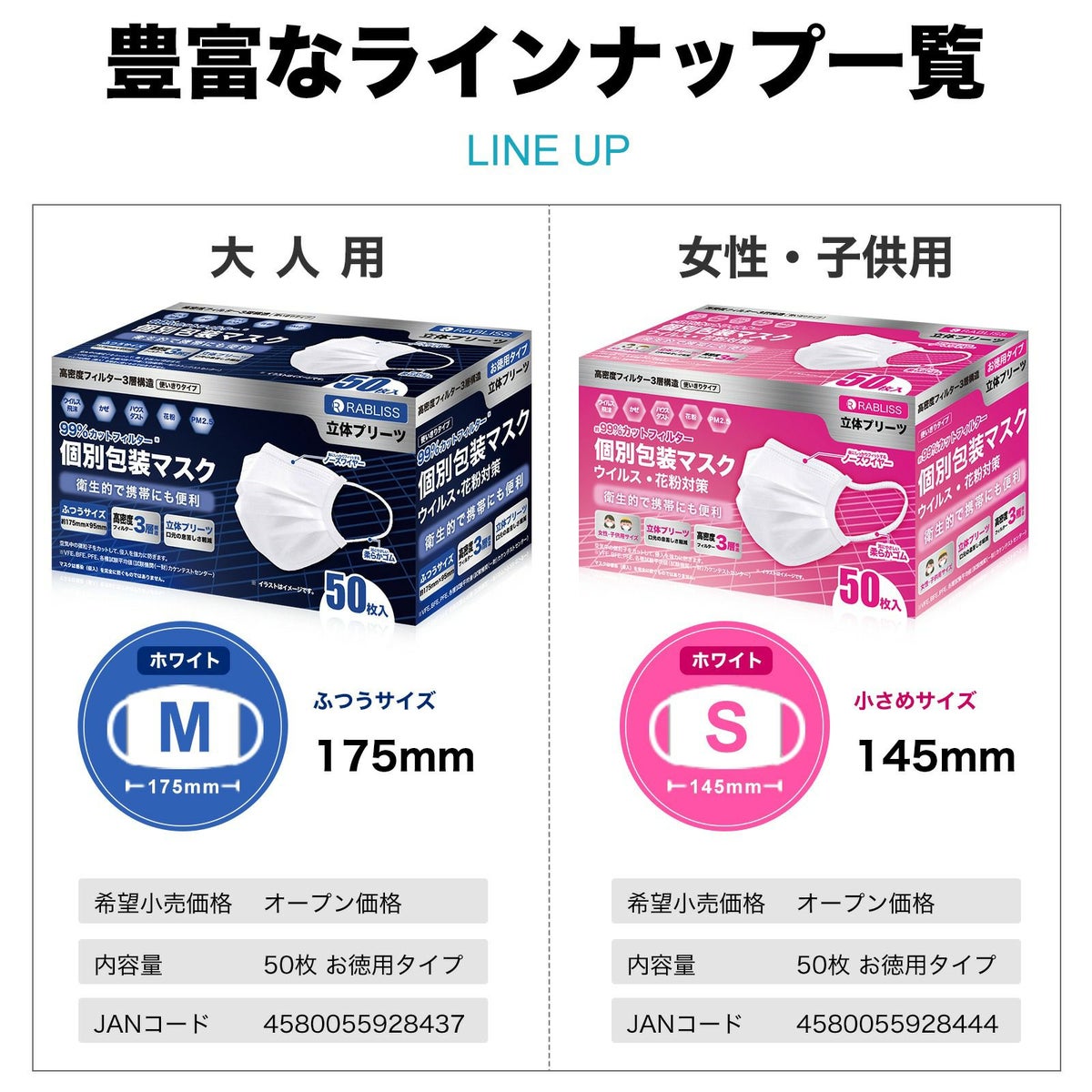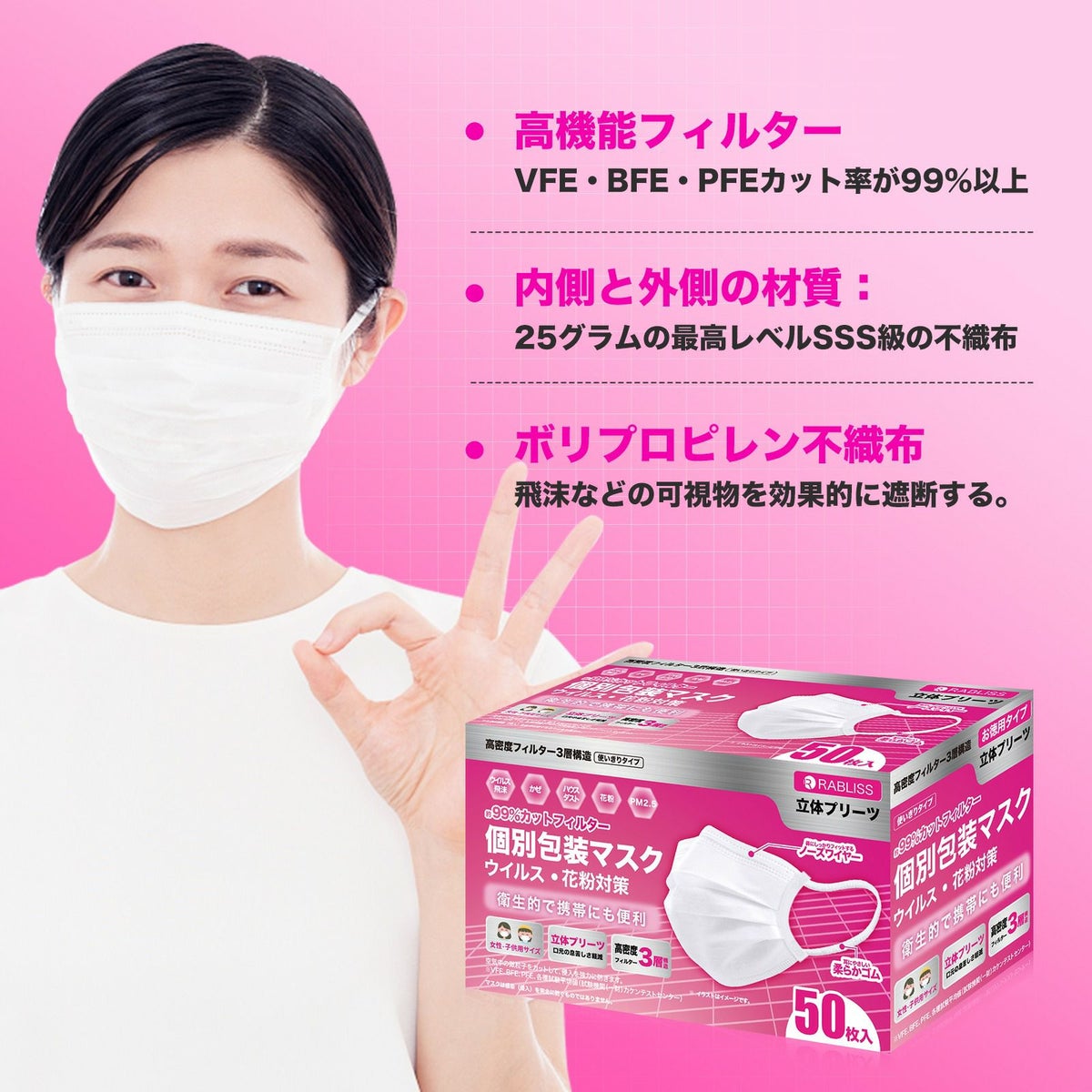 他の画像を見る 階段プリーツ 日本機構認証 BFE VFE PFE 99%cut CE・FDA RABLISS 個包装マスク 女性・子供用 50枚入 30箱セット 公式サイト特別価格 ¥ 13,200 税込 詳細を見る お気に入りに登録する