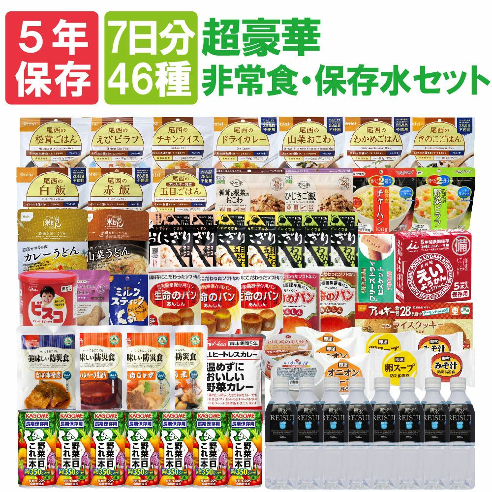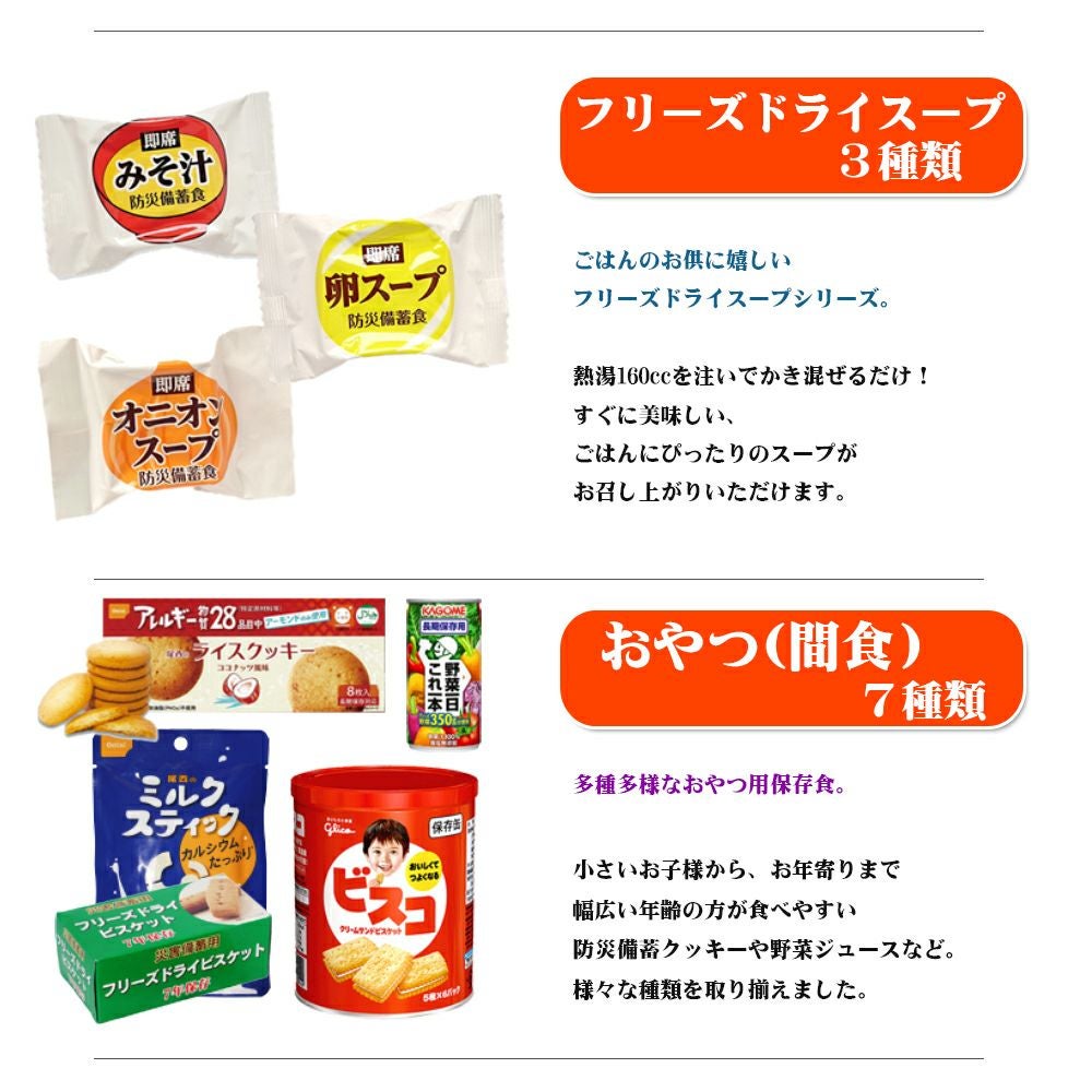 他の画像を見る 防災士考案!間食/夜食や、おすそ分け用として、手軽に食べられるおにぎりが日数分、野菜ジュースも日数分入ってます。 【超豪華】7日間分非常食セット[46種類73アイテム] 公式サイト特別価格 ¥ 18,600 税込 在庫切れ 詳細を見る お気に入りに登録する