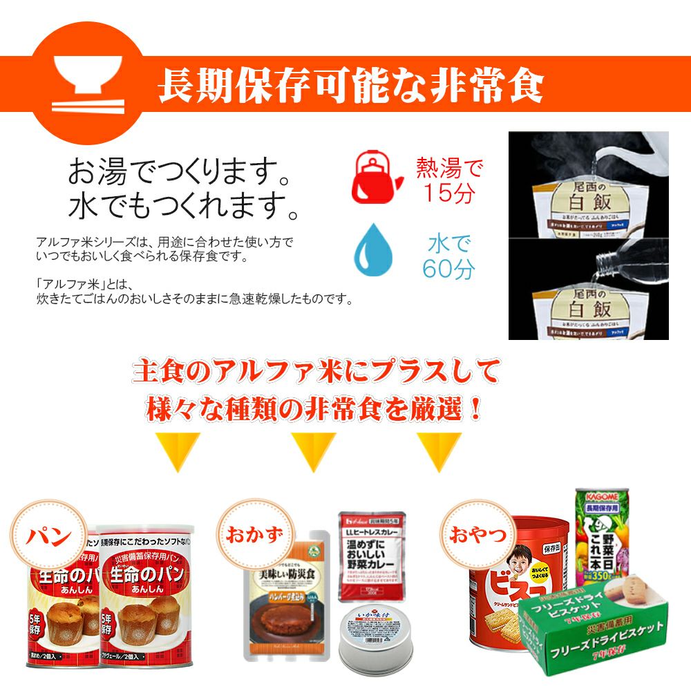 他の画像を見る 特定原材料等(アレルギー物質)28品目不使用 非常食 アルファ米 安心米「山菜おこわ 50食セット/箱」5年保存 国産米100% 公式サイト特別価格 ¥ 16,929 税込 在庫切れ 詳細を見る お気に入りに登録する