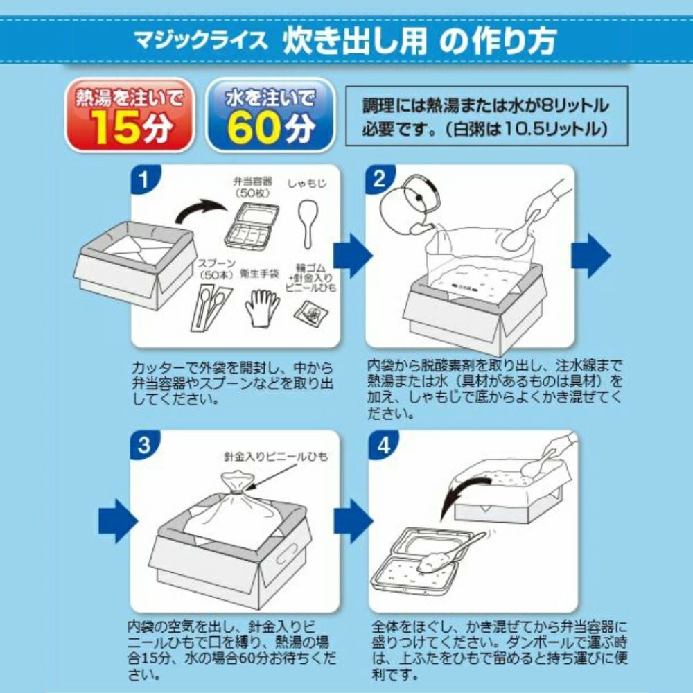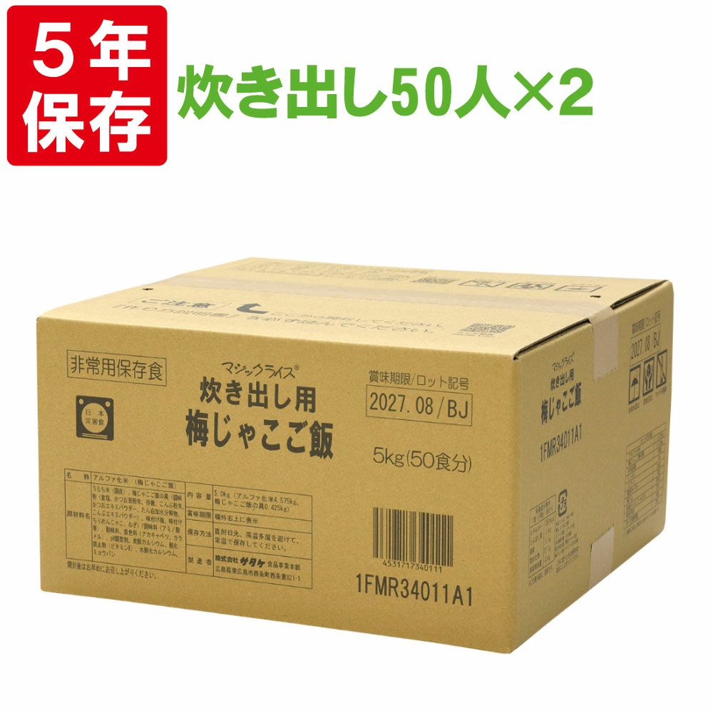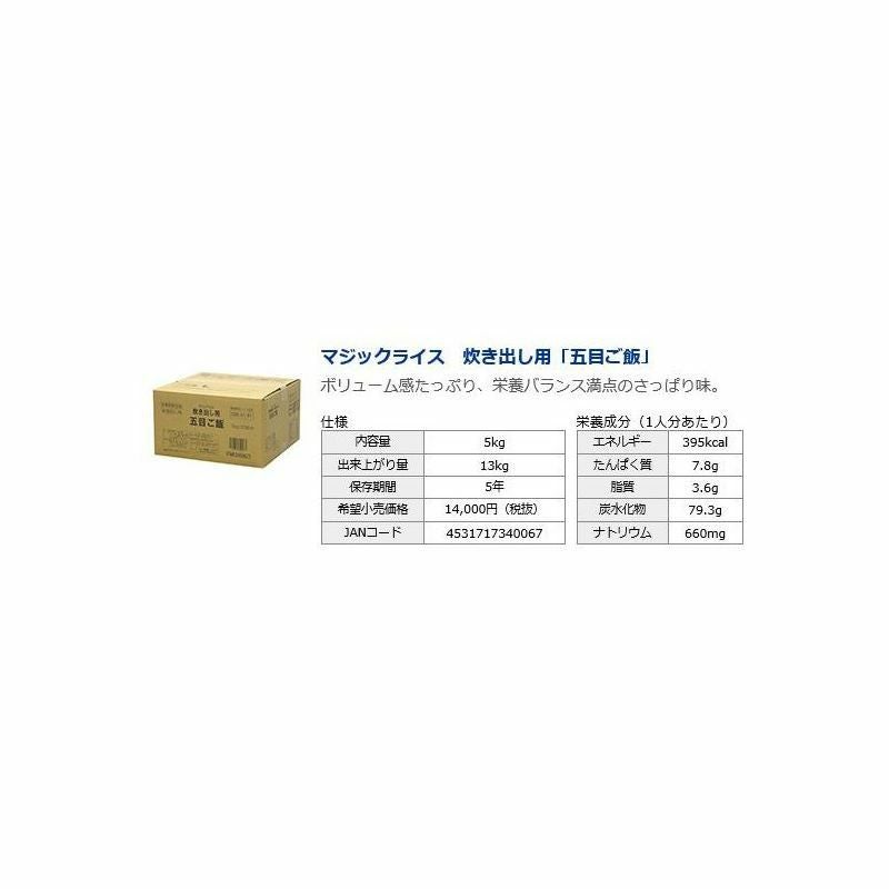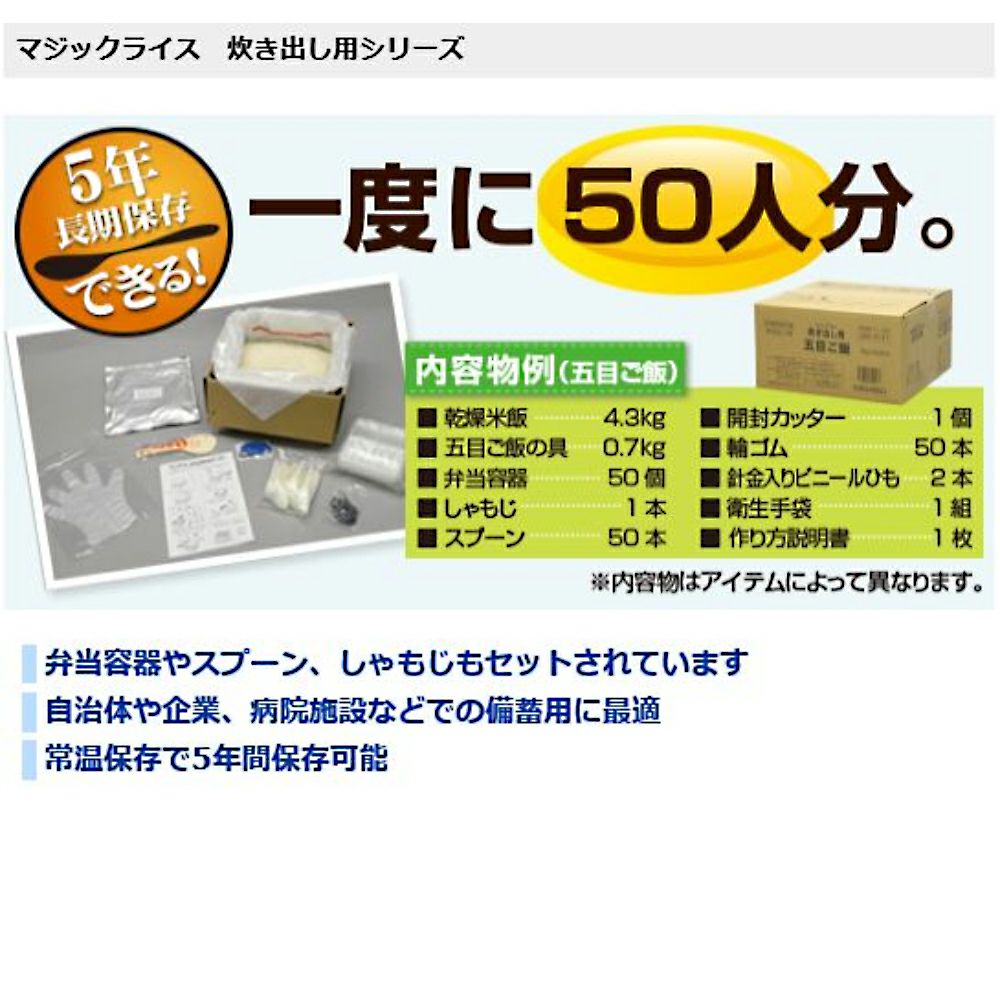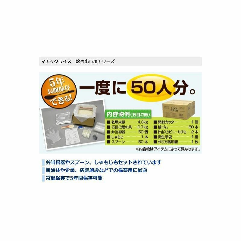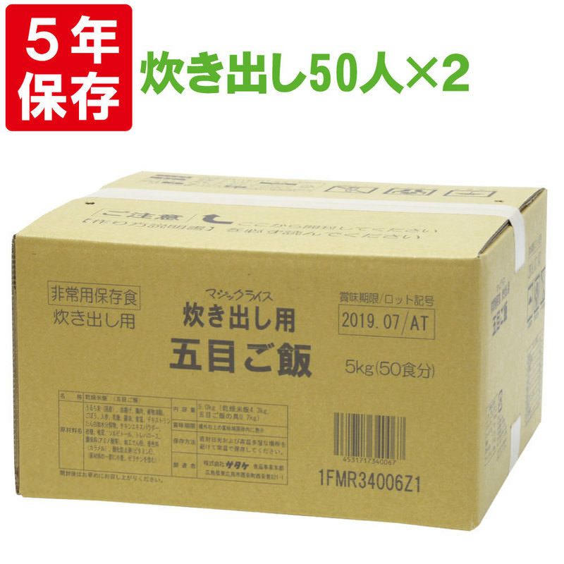 他の画像を見る 非常用保存食の決定版!!あらゆるシーンで大活躍!!5年間長期保存!! サタケマジックライス炊き出し用(五目ご飯)50人分×2セット保存期間5年 公式サイト特別価格 ¥ 25,111 税込 在庫切れ 詳細を見る お気に入りに登録する