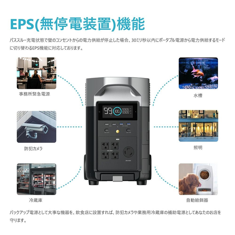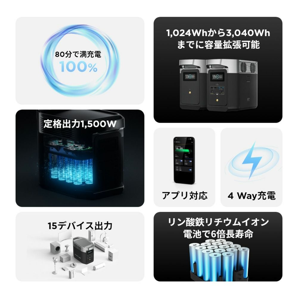 他の画像を見る 2+3年間のメーカー保証 容量拡張可能 80分で満充電 ポータブル電源 EcoFlow DELTA2 1024Wh ZMR330-JP 公式サイト特別価格 ¥ 132,715 税込 在庫切れ 詳細を見る お気に入りに登録する
