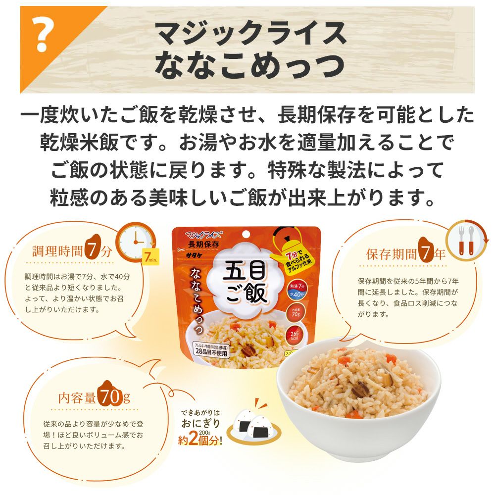 他の画像を見る アウトドア・海外旅行にも最適!お湯か水を適量加えるだけ!ご飯か雑炊、2通りの食べ方が出来ます! [5年保存] サタケ マジックライスミニ アレルギー対応 五目ご飯 50食/ケース 公式サイト特別価格 ¥ 13,080 税込 在庫切れ 詳細を見る お気に入りに登録する