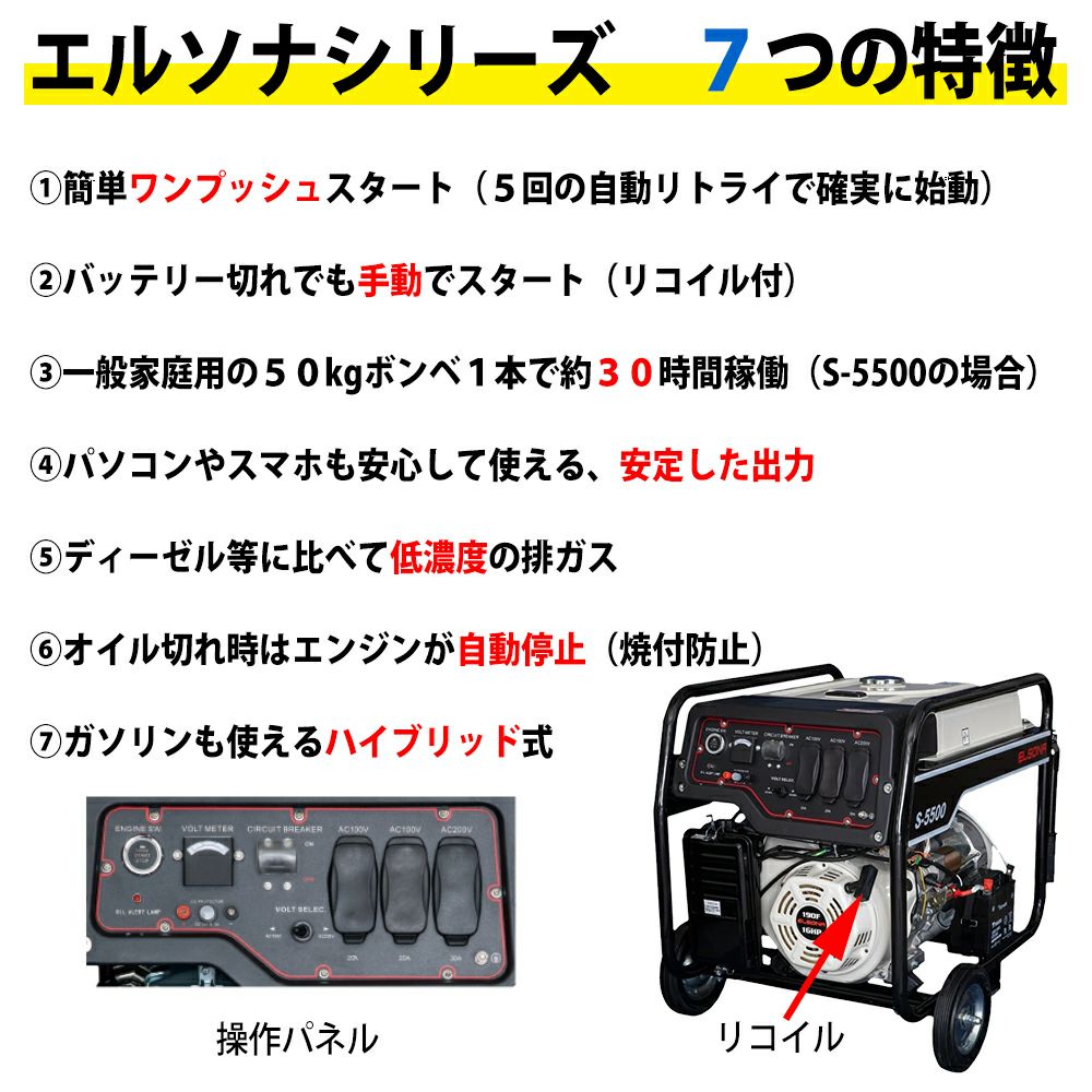 他の画像を見る 大家族一軒分の電力をカバー!非常時の電源確保 発電機 ハイブリッド式 (LPガス&ガソリン) 可搬型 ELSONA S-5500 公式サイト販売価格 ¥ 731,500 税込 在庫切れ 詳細を見る お気に入りに登録する