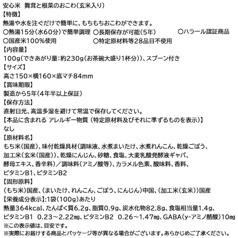 他の画像を見る 特定原材料等(アレルギー物質)28品目不使用 非常食 アルファ米 安心米 舞茸と根菜のおこわ(玄米入り) 50食 ケース 5年保存 公式サイト特別価格 ¥ 16,929 税込 詳細を見る お気に入りに登録する