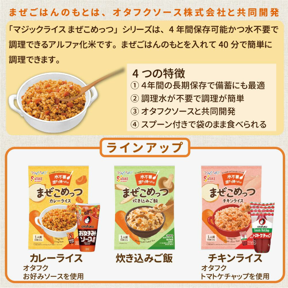 他の画像を見る 4年間保存可能かつ調理用の水不要で調理できるアルファ化米。まぜごはんのもとを入れて40分で簡単に調理できます。 非常食 まぜこめっつ 4年保存 カレー 炊き込みご飯 チキンライス 20食セット 防災食 非常用食品 ご飯 ごはん 御飯 お米 サタケ 公式サイト特別価格 ¥ 15,675 税込 詳細を見る お気に入りに登録する