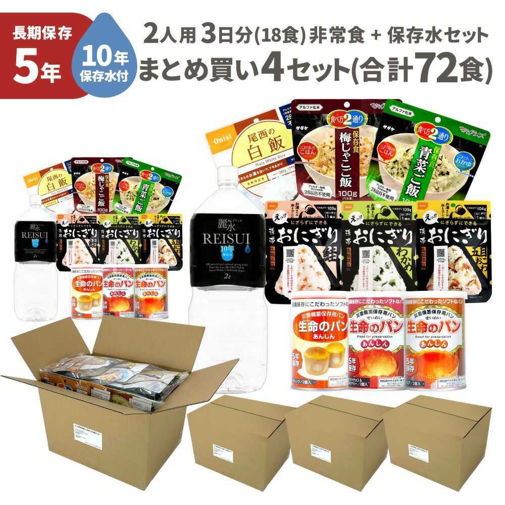 他の画像を見る 【 保存水付き 】 2人用非常食 3日分4セットをまとめ買い!団体様用備蓄にもオススメ 非常食セット 4セット ( 72食 ) 10年保存水付 2人用 3日分 18食 5年保存 まとめ買い 保存食 防災食 非常用食品 保存水 非常食5年 ご飯 お米 アルファ米 PEACEUP 公式サイト特別価格 ¥ 29,257 税込 詳細を見る お気に入りに登録する