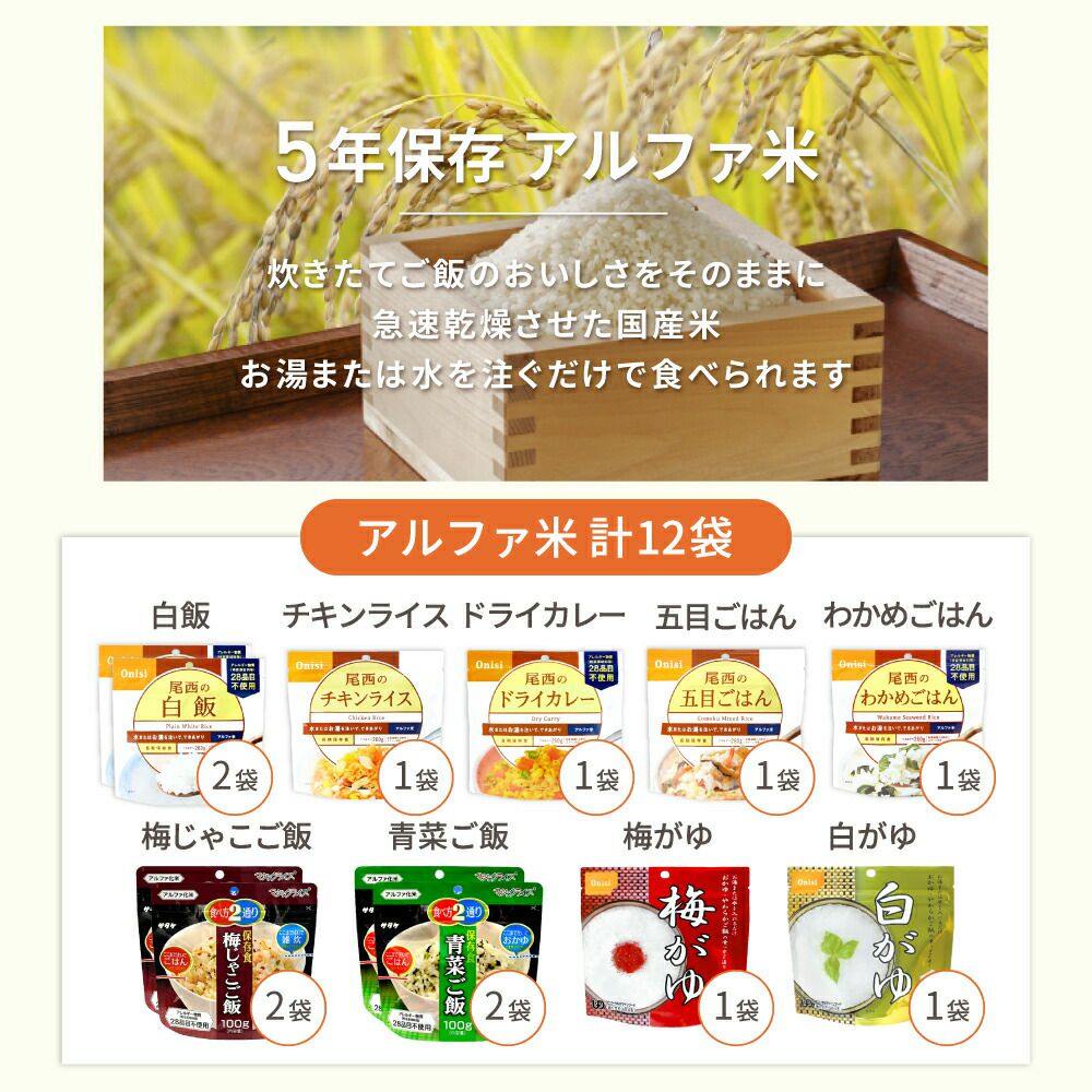 他の画像を見る 【 保存水付き 】 1人用非常食 3日分5セットをまとめ買い! 団体様用備蓄にもオススメ 非常食セット 5セット ( 45食 ) 10年保存水付 1人用 3日分 9食 5年保存 まとめ買い 保存食 防災食 非常用食品 保存水 非常食5年 ご飯 お米 アルファ米 PEACEUP 公式サイト特別価格 ¥ 20,520 税込 詳細を見る お気に入りに登録する