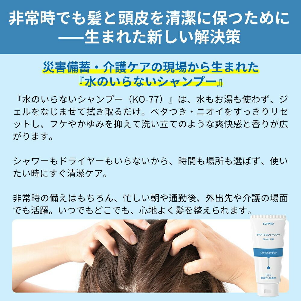 他の画像を見る ジェルをなじませて、拭き取るだけ。水がなくても髪と頭皮はスッキリ爽快! 防災用品 水のいらないシャンプー 40個/ケース ドライシャンプー 避難生活用品 水不要 洗い流し不要 ドライヤー不要 ジェル 弱酸性 無着色 頭皮 ベタつき 汚れ ニオイ 避難用グッズ 清潔 衛生 避難 防災 KO-77 SUPPINA 公式サイト特別価格 ¥ 27,170 税込 詳細を見る お気に入りに登録する