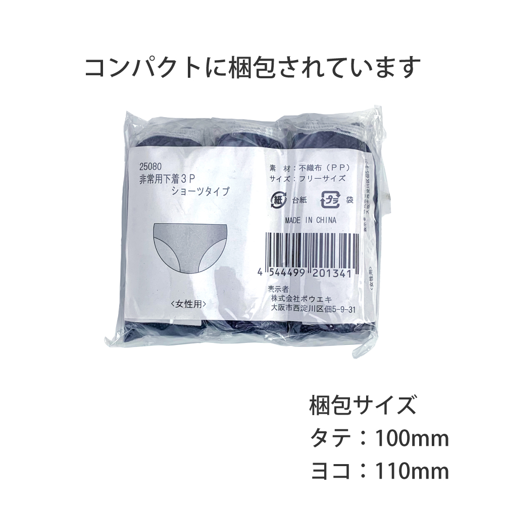 不織布製、コンパクトサイズの梱包で携帯、使い捨てで便利!非常時以外に旅行にも。 非常用下着3Pショーツタイプ メール便OK[1セット3個]4セットまで パンツ 防災備蓄用 携帯用 旅行用に