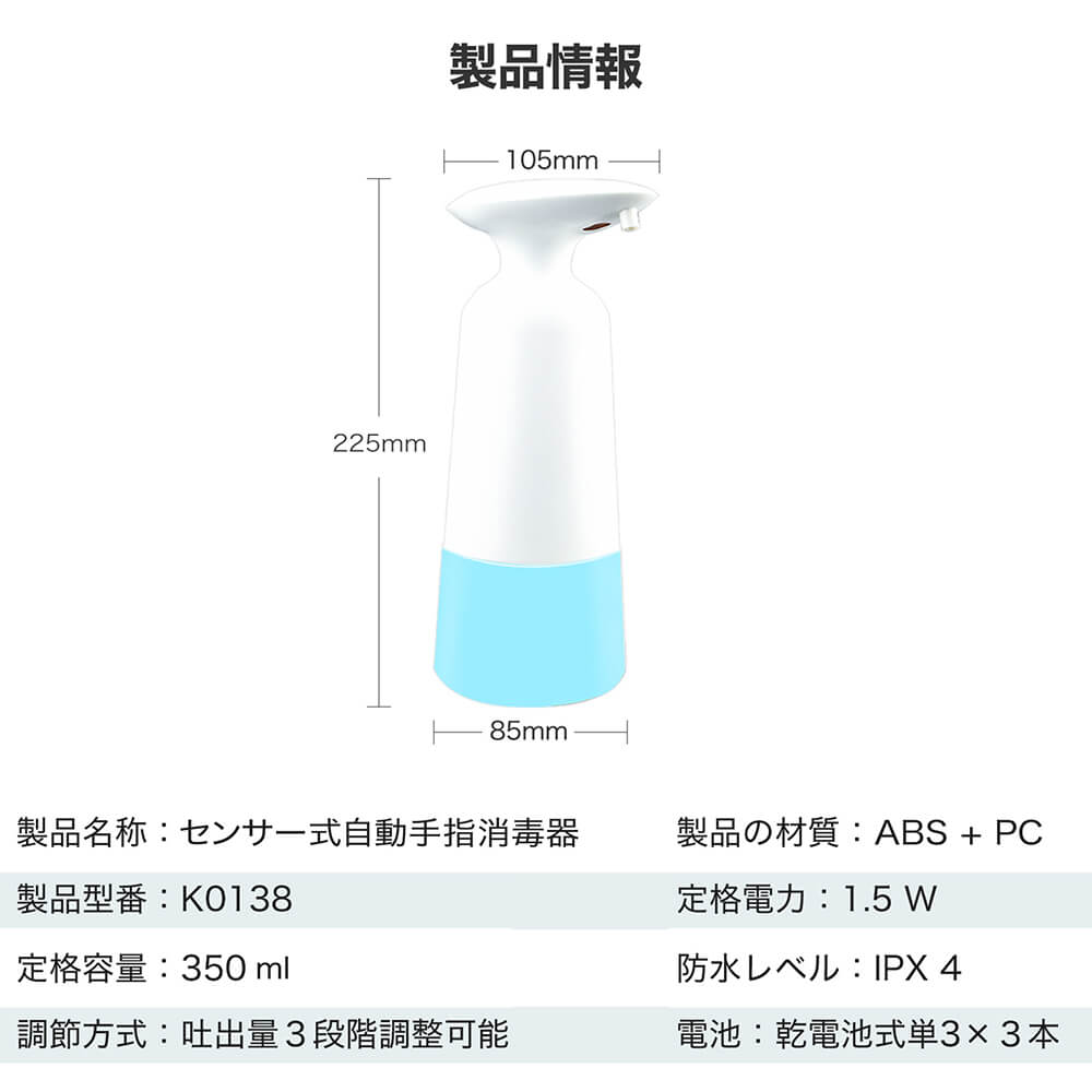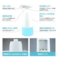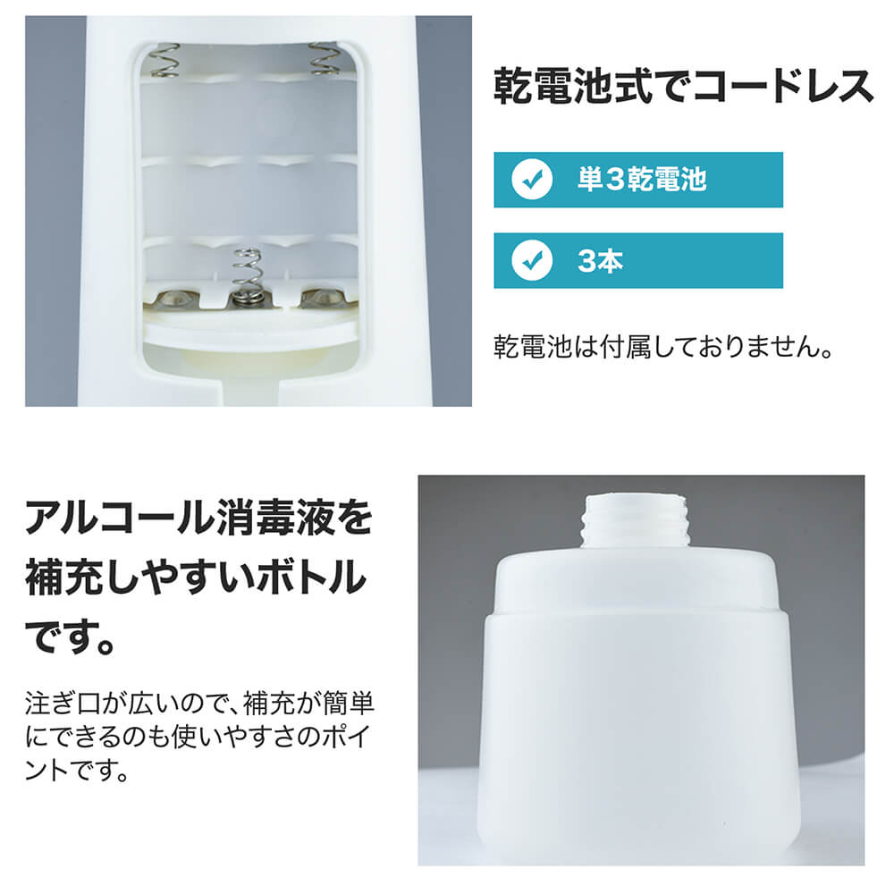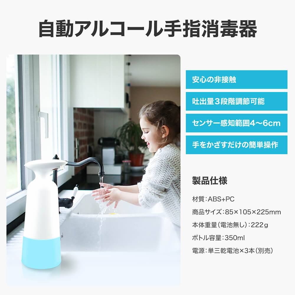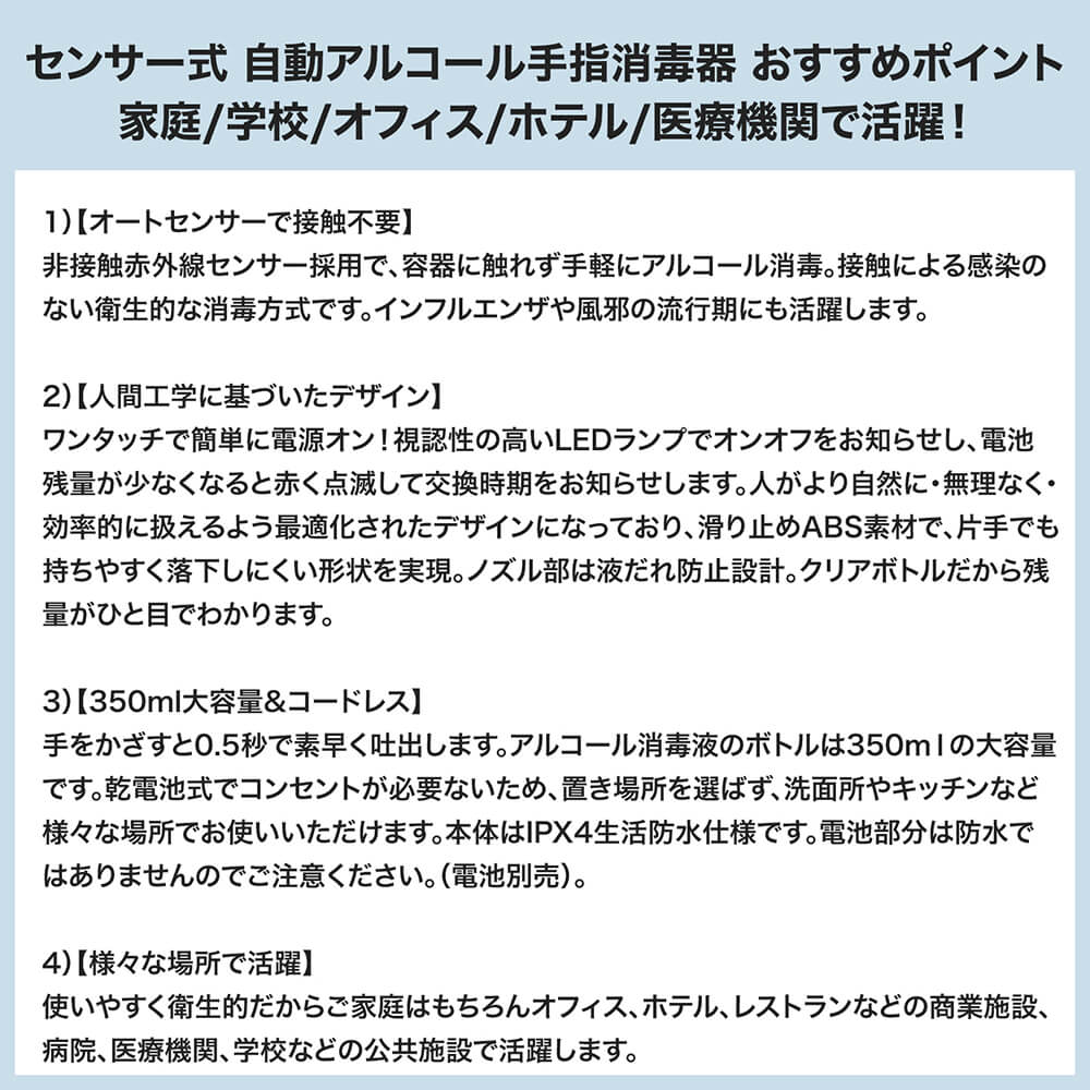 ・オートセンサー・プッシュ不要 非接触赤外線センサー採用で、容器に触れず手軽にアルコール消毒。接触による感染のない衛生的な消毒方式です。 インフルエンザや風邪の流行期にも活躍します。 ・機能美を反映するデザイン ワンタッチで簡単に電源オン!視認性の高いLEDランプでオンオフをお知らせ&電池残量が少なくなると赤く点滅して交換時期をお知らせします。 エルゴノミクスデザインと滑り止めabs素材で、片手でも持ちやすく落下しにくい形状を実現。ノズル部は液だれ防止設計。クリアボトルだから残量がひと目で把握できます。 ・350ml大容量&コードレス 手をかざすと0.5秒で素早くスプレー。 350ml大容量ボトルに加え入手しやすい単三形電池3本で動作します。 コンセントが必要ないため置き場所を選ばず、洗面所やキッチンなどでも気軽にお使いいただけます。 本体はipx4防水準拠。電池部分は防水ではありませんのでご注意ください。(電池別売)。 ・いろんな場所で活躍 使いやすく衛生的だからご家庭はもちろん事務室、ホテル、レストランなどの商業施設、病院、医療機関、学校などの公共施設でも活躍します。