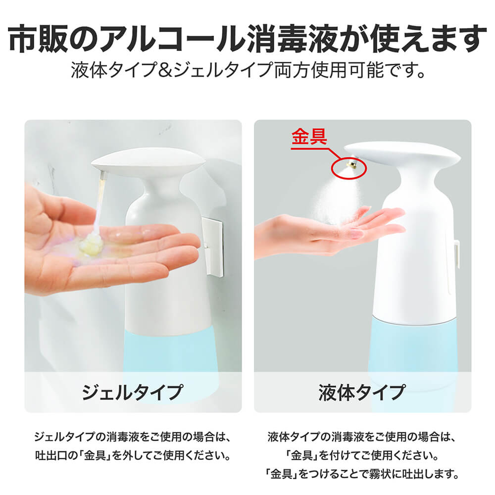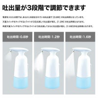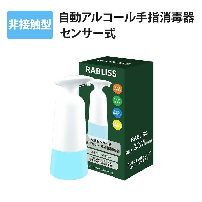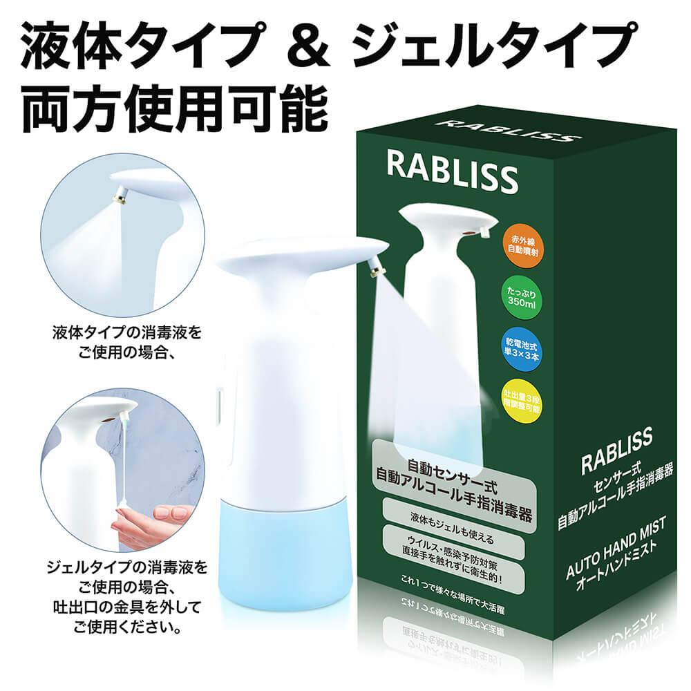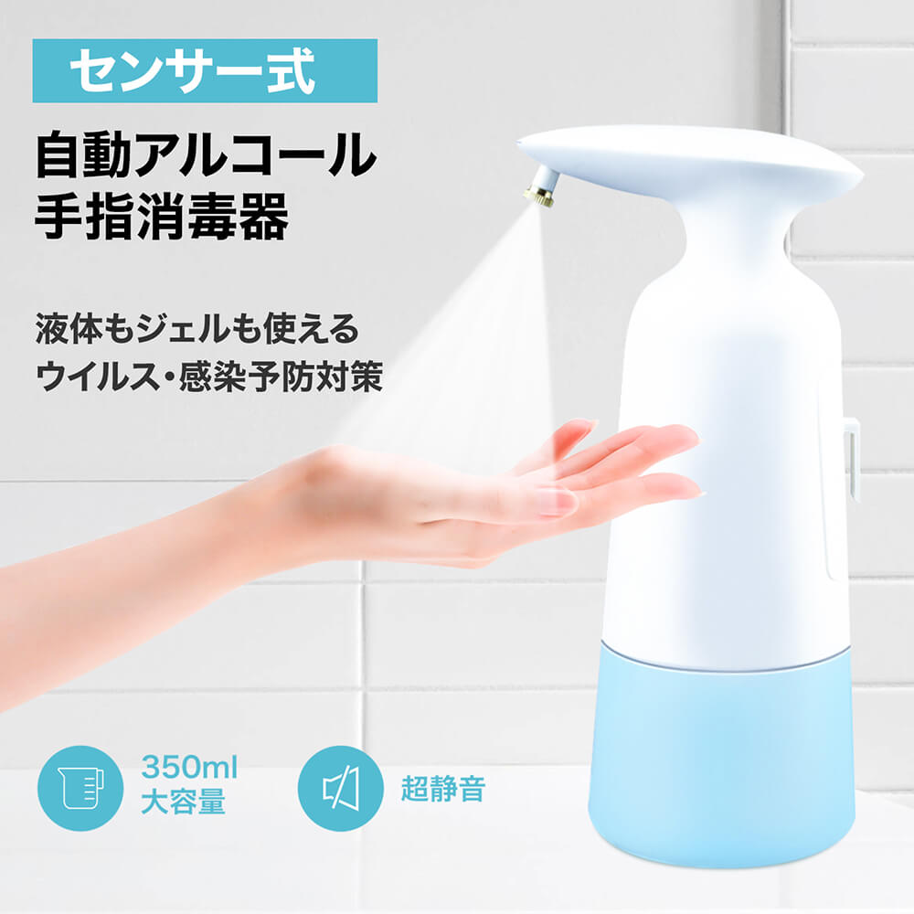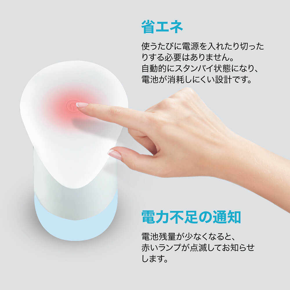 ・オートセンサー・プッシュ不要 非接触赤外線センサー採用で、容器に触れず手軽にアルコール消毒。接触による感染のない衛生的な消毒方式です。 インフルエンザや風邪の流行期にも活躍します。 ・機能美を反映するデザイン ワンタッチで簡単に電源オン!視認性の高いLEDランプでオンオフをお知らせ&電池残量が少なくなると赤く点滅して交換時期をお知らせします。 エルゴノミクスデザインと滑り止めabs素材で、片手でも持ちやすく落下しにくい形状を実現。ノズル部は液だれ防止設計。クリアボトルだから残量がひと目で把握できます。 ・350ml大容量&コードレス 手をかざすと0.5秒で素早くスプレー。 350ml大容量ボトルに加え入手しやすい単三形電池3本で動作します。 コンセントが必要ないため置き場所を選ばず、洗面所やキッチンなどでも気軽にお使いいただけます。 本体はipx4防水準拠。電池部分は防水ではありませんのでご注意ください。(電池別売)。 ・いろんな場所で活躍 使いやすく衛生的だからご家庭はもちろん事務室、ホテル、レストランなどの商業施設、病院、医療機関、学校などの公共施設でも活躍します。