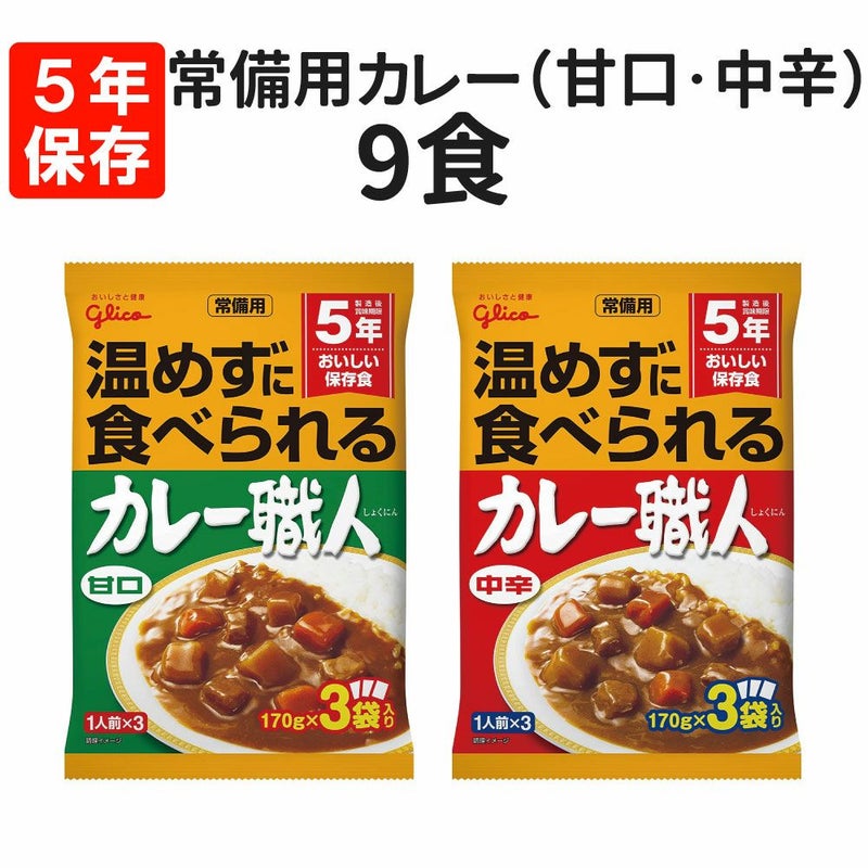 5年保存 非常食 常備用カレー職人 9食 選べる(甘口3/中辛3)×3 多くの方に受け入れられる国民食のカレー保存食 お客様から寄せられた声にグリコがお答えした商品 常備用カレー職人の特徴 賞味期限を3年から5年に変更したグリコの販売実績 温めなくても食べられる、お手頃な価格、備蓄のバリエーションに、子供にも食べやすい甘口タイプも グリコの賞味期限お知らせシステム