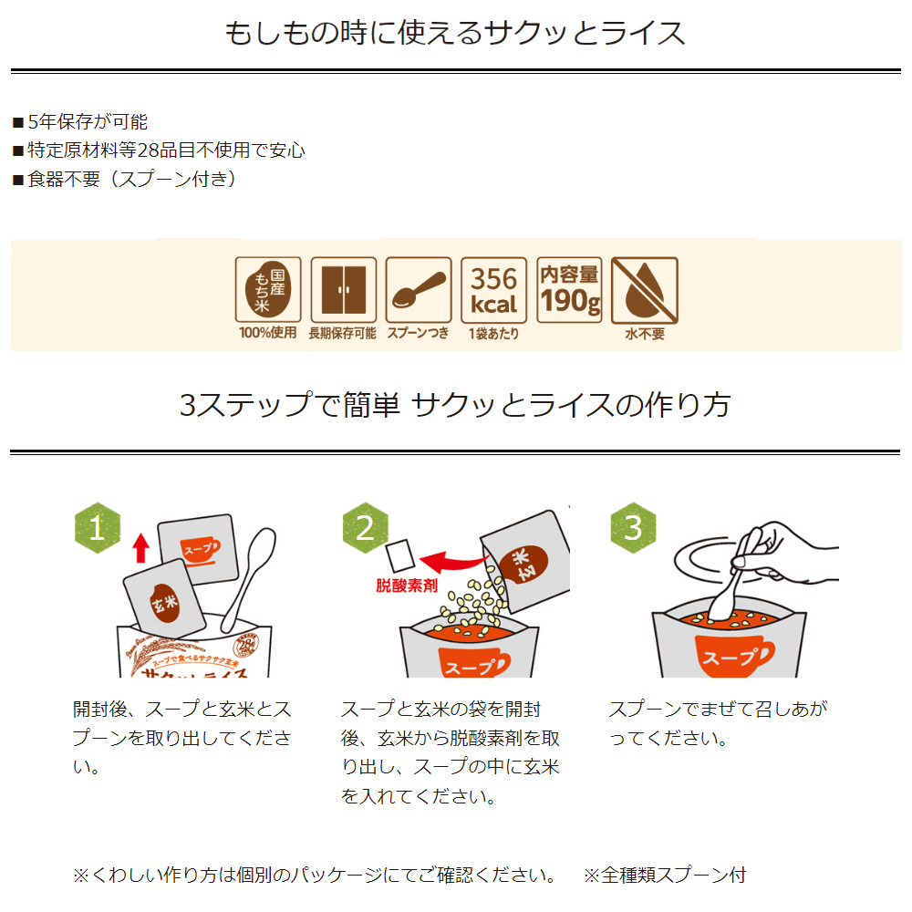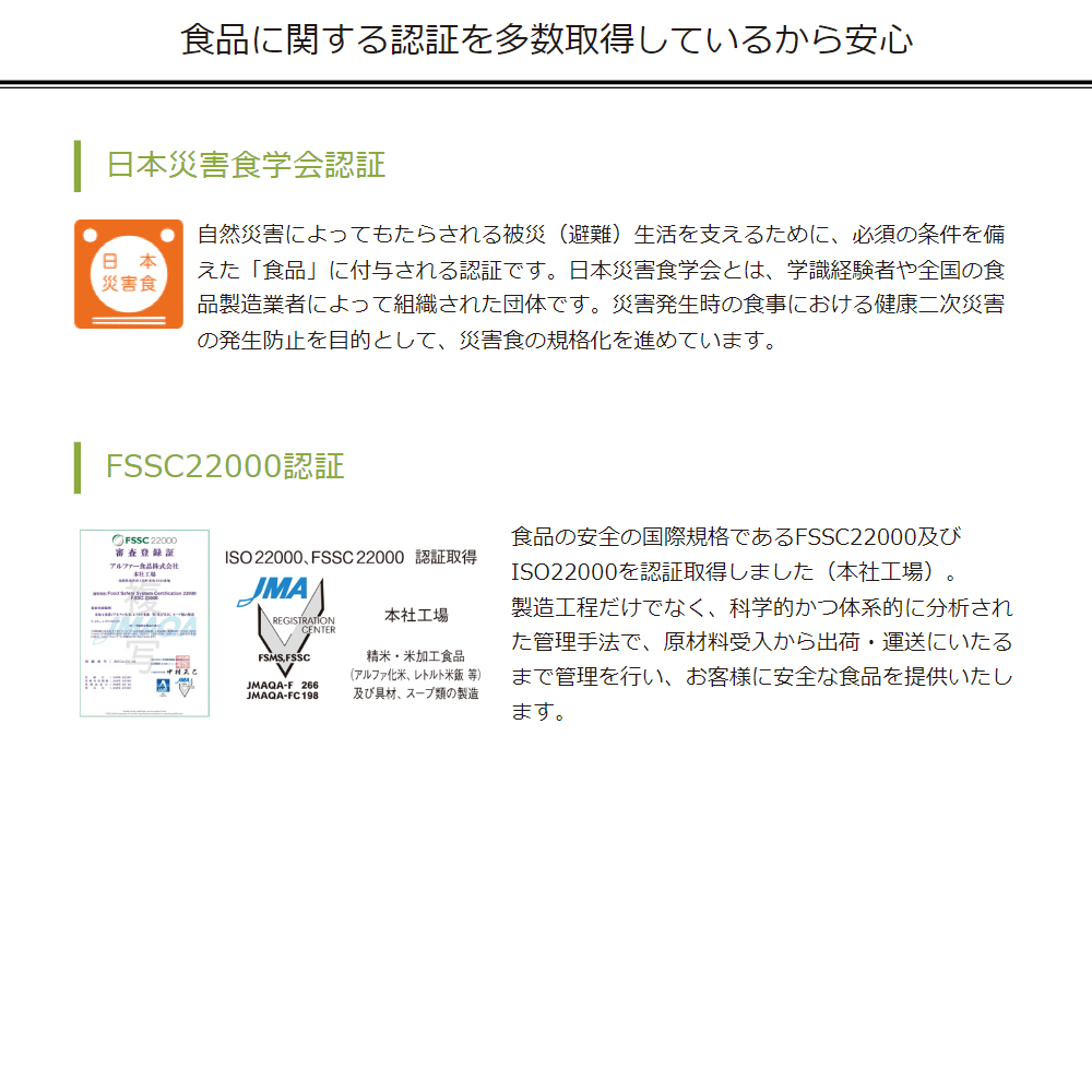 災害にあった際の非常食として長期保存や備蓄ができるご飯や食料食品のセットです。地震対策やサバイバル用としておすすめします。 保存食は進化し、今では幅広いニーズに応えられるようになっています。災害時にも普段食べ慣れた美味しい食事を摂ることができます。 保存食といえばなにを思い浮かべるでしょうか。乾パンや魚の缶詰、レトルトカレーやインスタントラーメンなどではないでしょうか? 今の保存食は、柔らかなごはんやパン、スープやハンバーグなど多種多様な種類、味が取り揃えられており、幅広いニーズに応えられるようになっていて、災害時にも食べ慣れた美味しい食事を摂ることができます。 アルファ米の『アルファ』とは、お米に含まれる「デンプンの状態」を示しています。お米は70?80%がデンプンでできています。生デンプン(生米)は、そのまま食べてもまずく、消化しにくいため栄養になりにくいのですが、水を含ませ熱を加えると、美味しくて、しかも消化しやすいデンプンに変わります。アルファ化したご飯は水分を除く(乾燥)と、生デンプンへ戻らず「アルファ化デンプン」の状態を保ち続けます。そして、このアルファ米にお湯や水を加えると、煮炊きせずとも、軟らかく美味しいご飯ができ上る、という訳です。 アルファ米は宇宙食や南極探検隊などでも使われている「インスタントごはん」とも言えるものです。 アルファ米にはさまざまな種類があり、白飯・白粥などから松茸・パエリア風・えびピラフなどさまざまな味があります。 アレルギー要素フリーなものや肉や魚、卵などが入っていないものなどもあります。 わたしはごはんではなくパン派。そういった方は「パンの缶詰」です。 普段食べているようなやわらかいパンをそのまま缶詰にしました。カンパンより食べやすく、ふんわりとした食感が特徴です。パンの缶詰はいつでも柔らかく、しっとりとした味わいです。喉が渇かないように甘みを抑えてあり、脱酵素剤や防腐剤なども使っていません。 チョコレート&ストロベリーやココア、黒まめなど味も多様で、エッグフリーなどアレルギーに対応したものもあり、安心して食べられます。 常温でもそのまま美味しいスープやお湯を入れるだけでできたてのスープになるフリーズドライスープなどを用意しておけば、 いつでも、どんなときでも本格スープを簡単に味わうことができ、栄養と水分を同時に摂取、心も身体も温めることができます。 100kcal以下、食塩相当量1g以下!しかも化学調味料無添加のものなど、健康が気になるかたでも安心して飲むことができます。 ハンバーグやさばの味噌煮、牛丼、肉じゃがまで日常のおかずも保存食に!!冷凍の必要がなく、常温で3?5年間保存ができ、そのままでも美味しく食べられます。キャンプなどのレジャー用など日常でも味わうことができます。 甘いものはこころを和ませてくれ、手軽にエネルギー補給が可能です。えいようかんやクッキー、ケーキの缶詰などがあります。スティックなどもあります。アレルゲンフリーのものもあります。 保存食には、アレルギーの原因となるアレルゲンフリーのものも数多く用意されています。また、組み合わせ次第ではベジタリアンの方や、子どもや年配の方にも満足できる保存食を用意することができます。 保存食は冷たくて寂しいイメージがありますが、温めることで、何倍にも美味しくなります。少量の水さえあれば、いつでも食事を暖められます。ご飯やおかずはもちろん、パンの缶詰もアツアツで美味しく食べることができます。 いざというときの備蓄だけではなく、キャンプやアウトドアのお供に、またプレゼントとしても!! 災害から支援物資が届くまでの最低3日分?7日分の水と食料を備えて置くことが推奨されています。 災害時には水や食料が店頭から売り切れるなど、物流が止まることも想定されるため、自分や家族を含めた用意をしておきましょう。