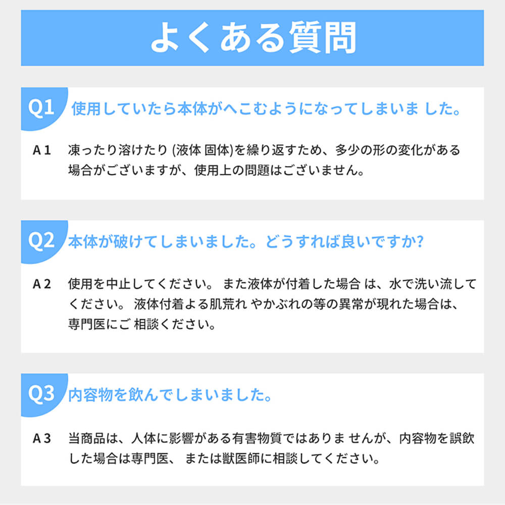 ・溶けた後は、冷蔵庫で20分、冷凍庫では5分、流水で約30分間、28℃以下の環境下であれば自然にも凝固し、繰り返し半永久的にご使用できます。