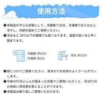 ■使用方法 ■本製品を平らな状態にして、冷蔵庫で20分、冷凍庫では5分、以上冷やし内部を硬化させてご使用ください。 ■冷水など 28℃以下の環境でも硬化します。温度が低いほど早く固まります。 ■中身のPCM素材が固まった状態でご使用いただくと、 約28℃の心地良い清涼感を感じます。 ■首につけてご使用ください。 首まわりを心地よくクールダウンします。 ■本製品は繰り返しご使用いただけます。