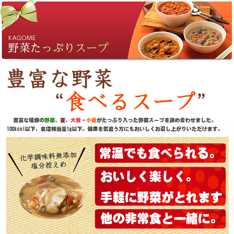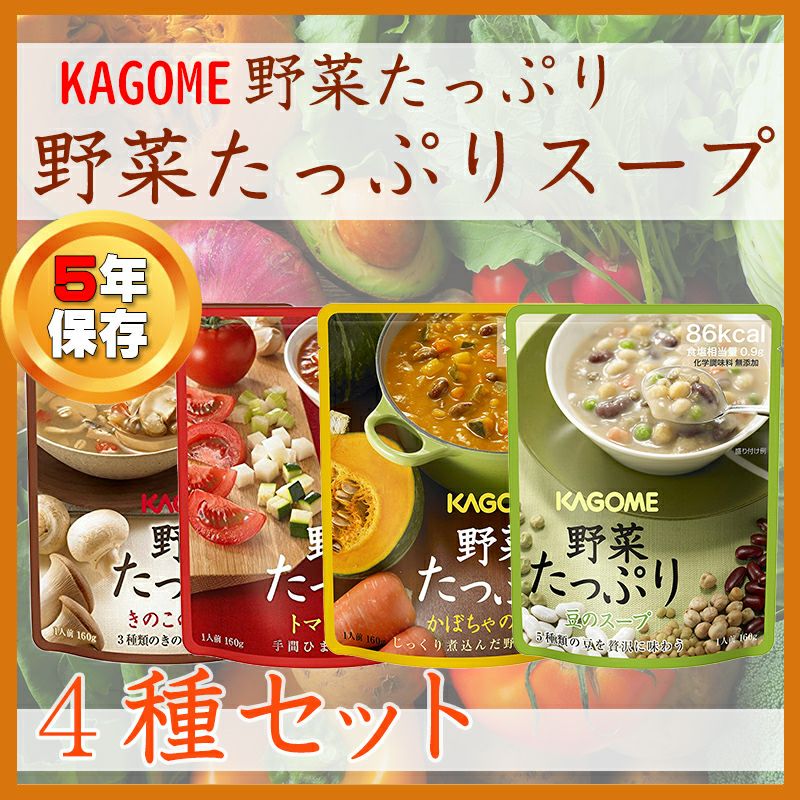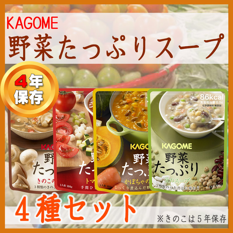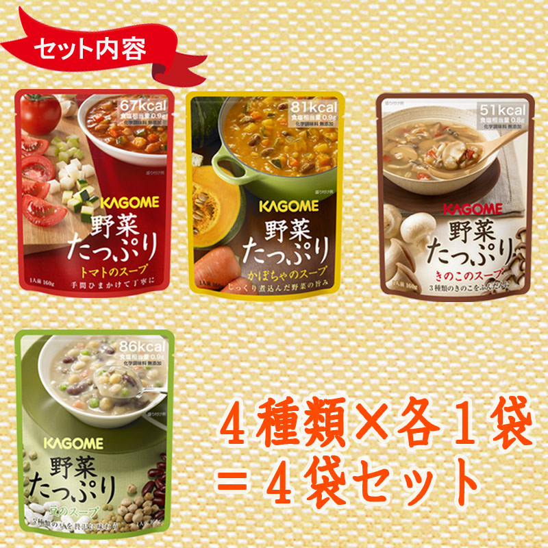 化学調味料無添加!KAGOMEの常温でもおいしいレトルトパウチ非常食 【メール便OK(1セットまで)】カゴメ 野菜たっぷりスープ バラエティ4種セット「きのこのスープ/トマトのスープ/カボチャのスープ/豆のスープ」