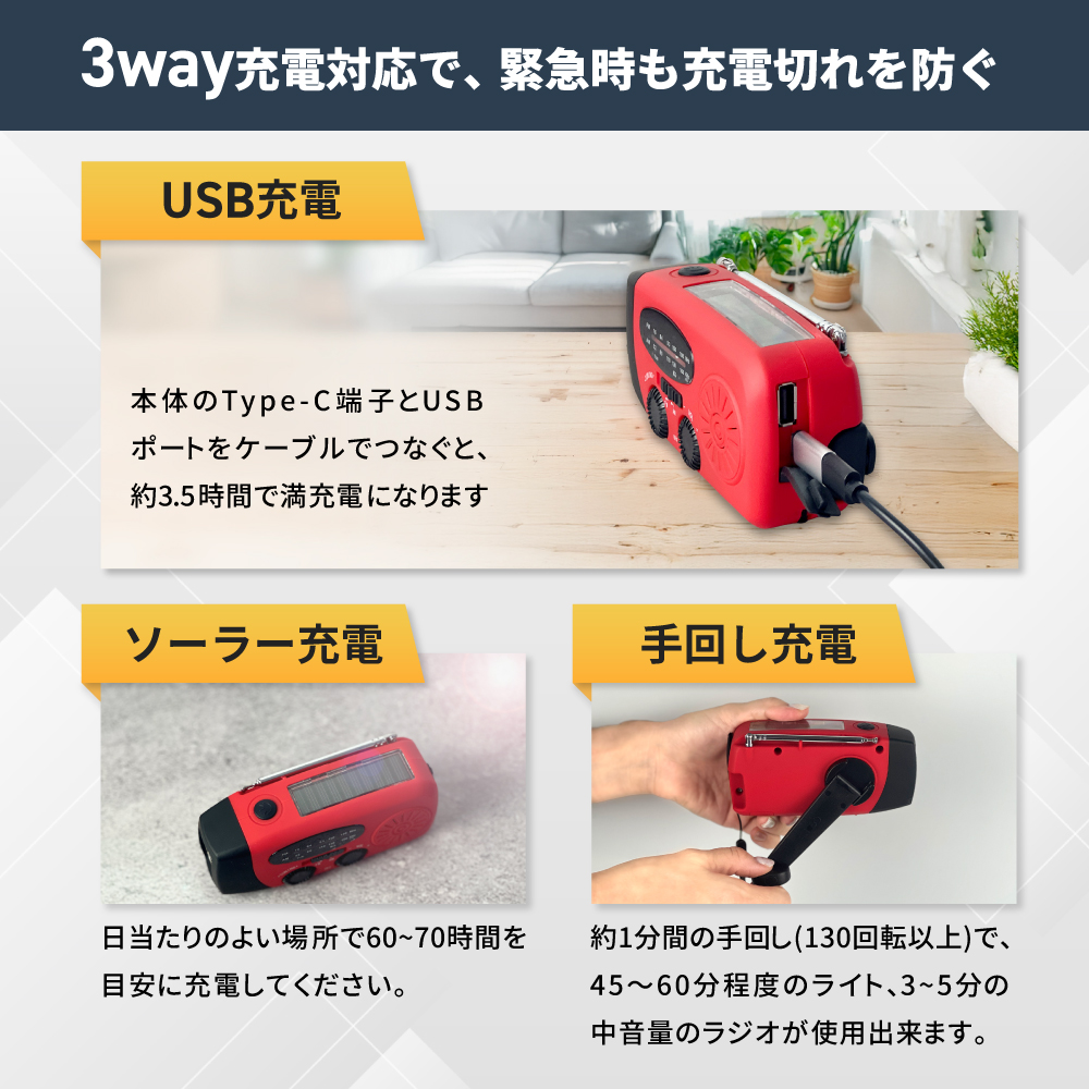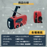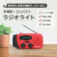 上記の照明・バッテリー・ラジオなどがありますが、それを一つに纏めた多機能防災ラジオがあり、その上軽量かつ、小さめの商品があり持ち運びもしやすく、防災リュックに入れてもスペースを取ることがありません。手回し発電(ダイナモ発電)は電池切れた上に乾電池がない場合、多機能ラジオに付いている手回し発電の機能でラジオが聞けるようになります、またソーラーパネル付きの多機能ラジオもあり、晴天時にラジオを充電することが可能です。