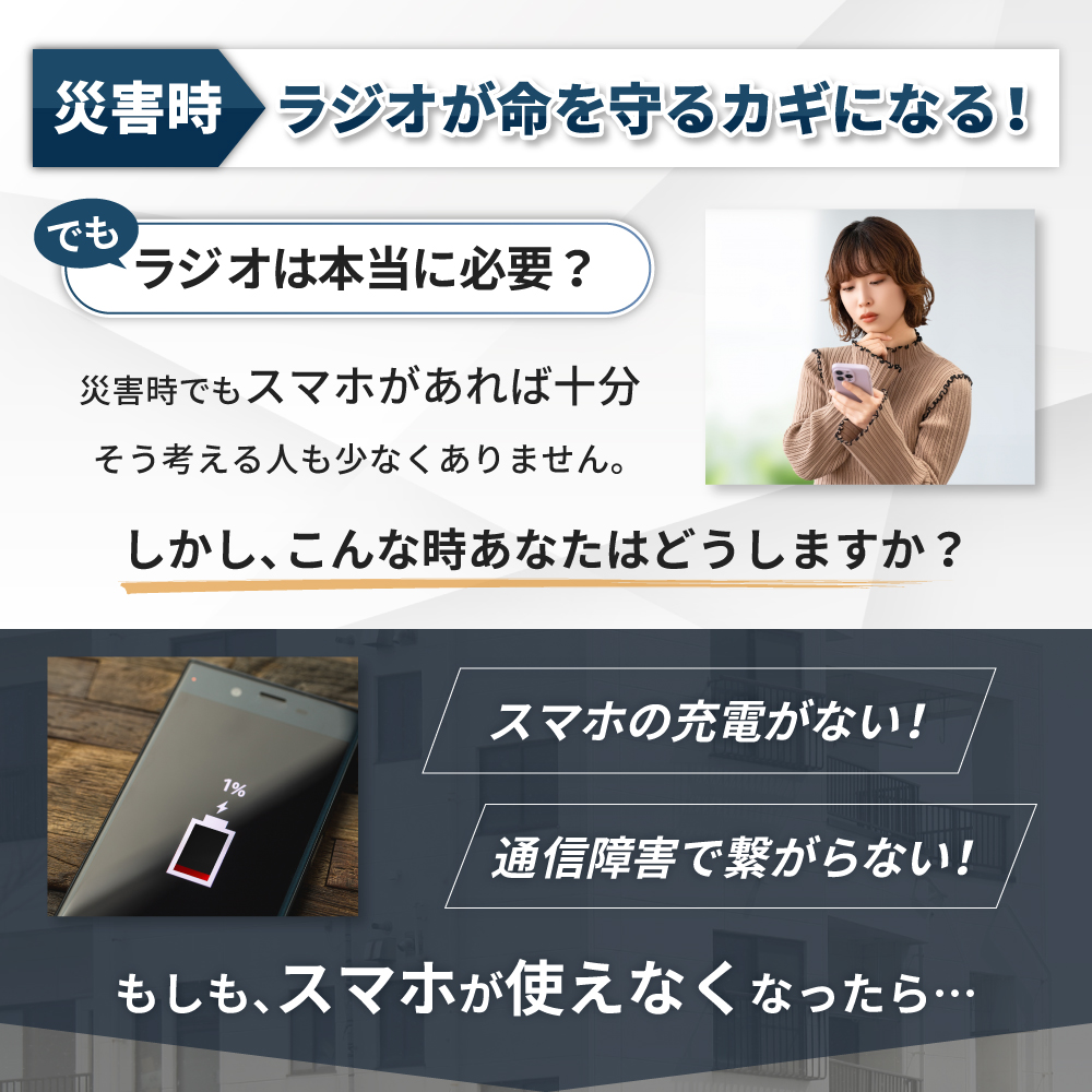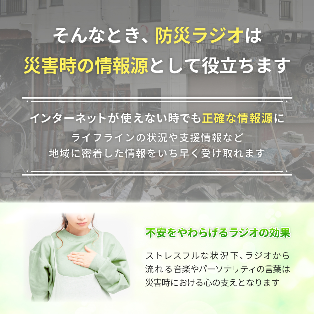 停電時や災害時に役立つ防災アイテムの一つです、停電時や災害の際、テレビが見れなくなり、停電時でもバッテリーが付いた、パソコンやスマホでも、バッテリーの量が減っていき、ネットが繋がらなかったり、情報を得たとしてもそれがデマ情報だった場合もあります、そこでラジオが活躍します。
