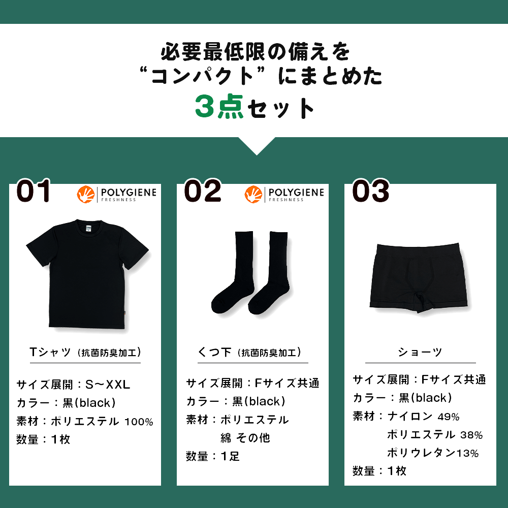 3. 災害時 防災用衣類キット 3点セット Tシャツ ショーツ 靴下 防臭 抗菌 ユニセックス フリーサイズ メール便1セットまで