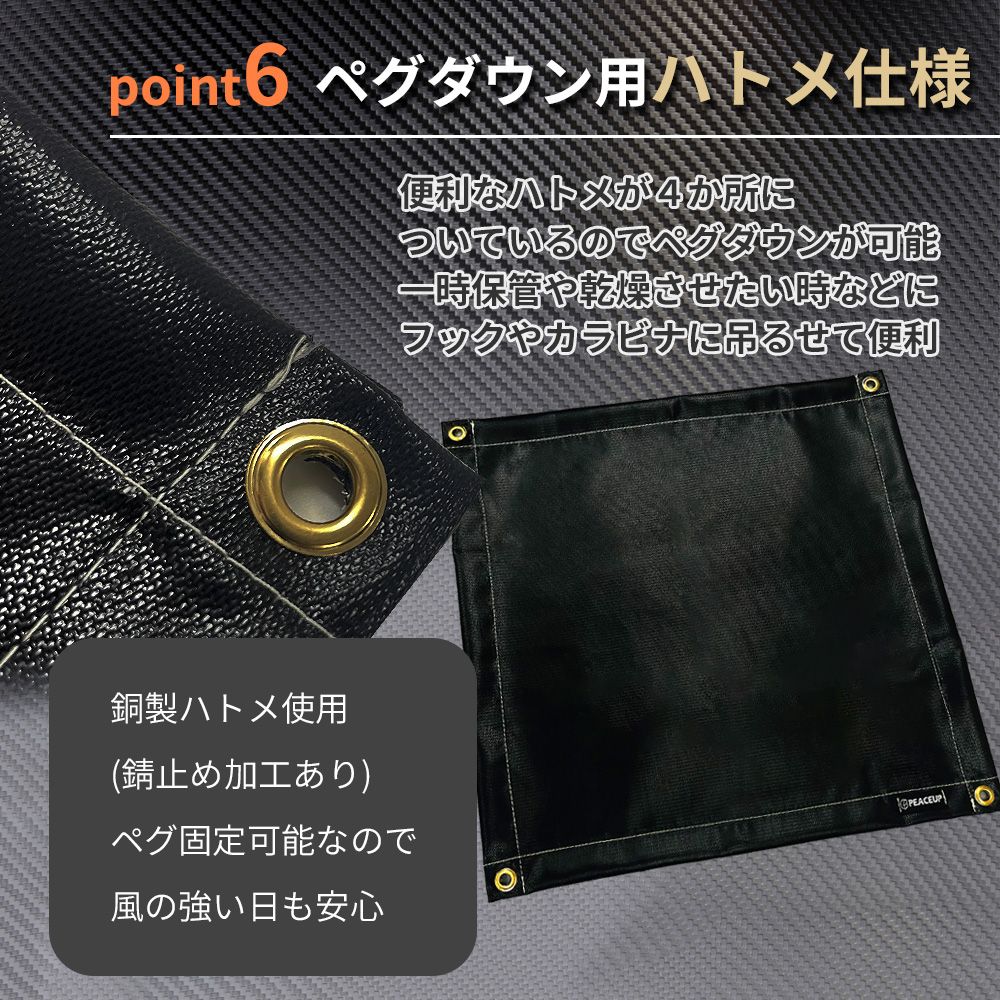 ●熱に強い難燃性素材 ●優れた耐熱・耐久性 ●汚れに強い撥水性 ●特殊加工による滑らかな手触り ●柔らかい生地でコンパクト収納可 ●ペグダウン用ハトメ使用