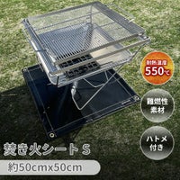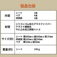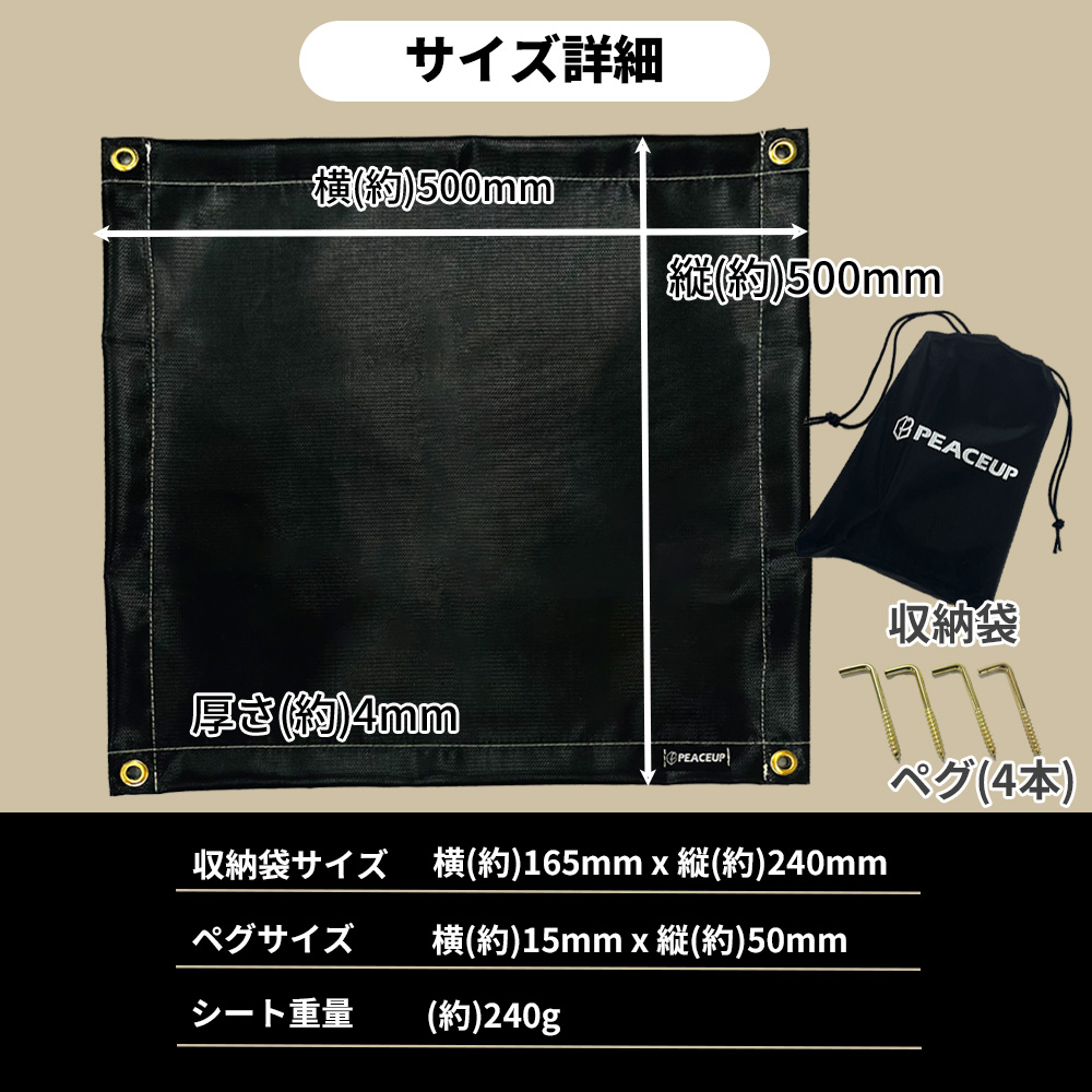 ■内容 ・シート:1枚 ・ペグ:4本 ・収納袋:1枚 ■材質 ・シリコンゴム加工グラスファイバー ・アラミド繊維糸 ・サビ止め加工銅製ハトメ ■サイズ ・本体(約):横500mm x 縦500mm x 厚さ4mm ・収納袋(約):横165mm x 縦240mm ・ペグ(約):横15mm x 縦50mm ■重量 ・シート(約):240g