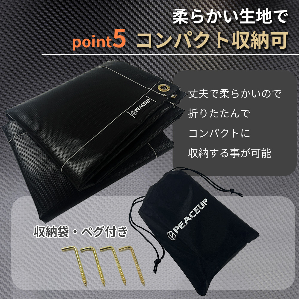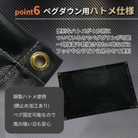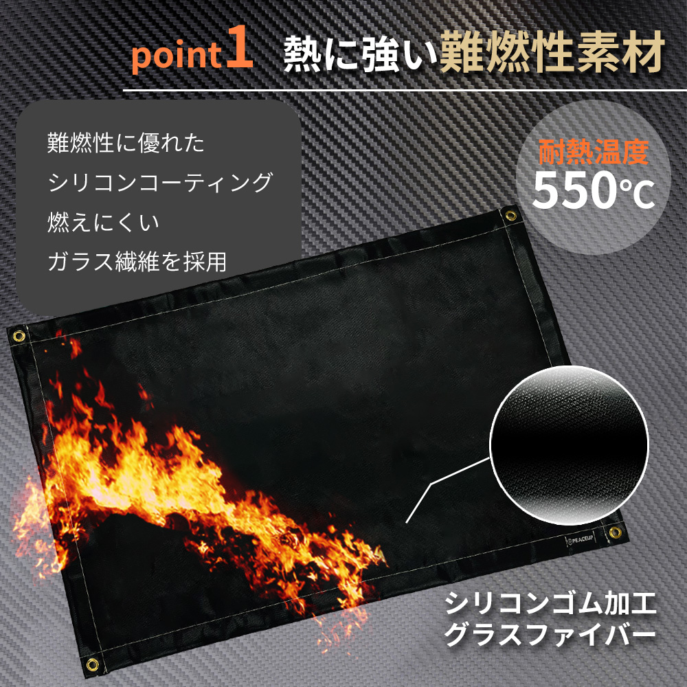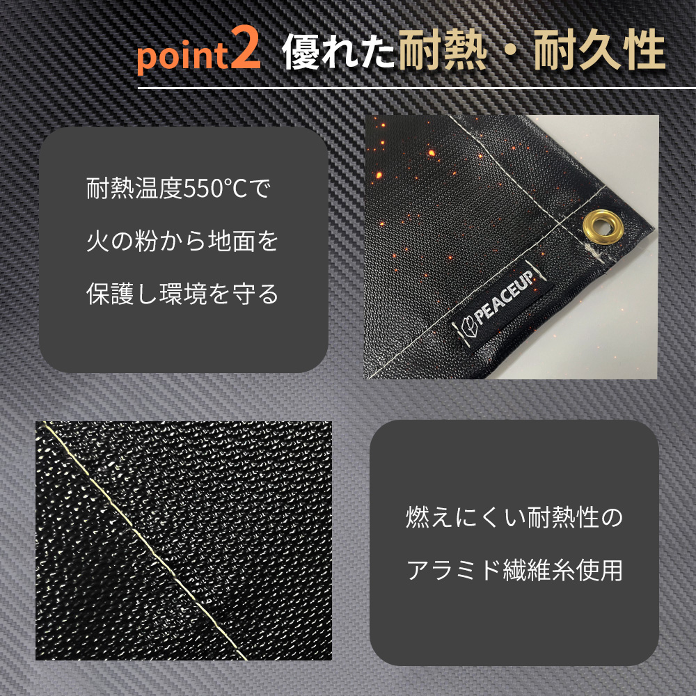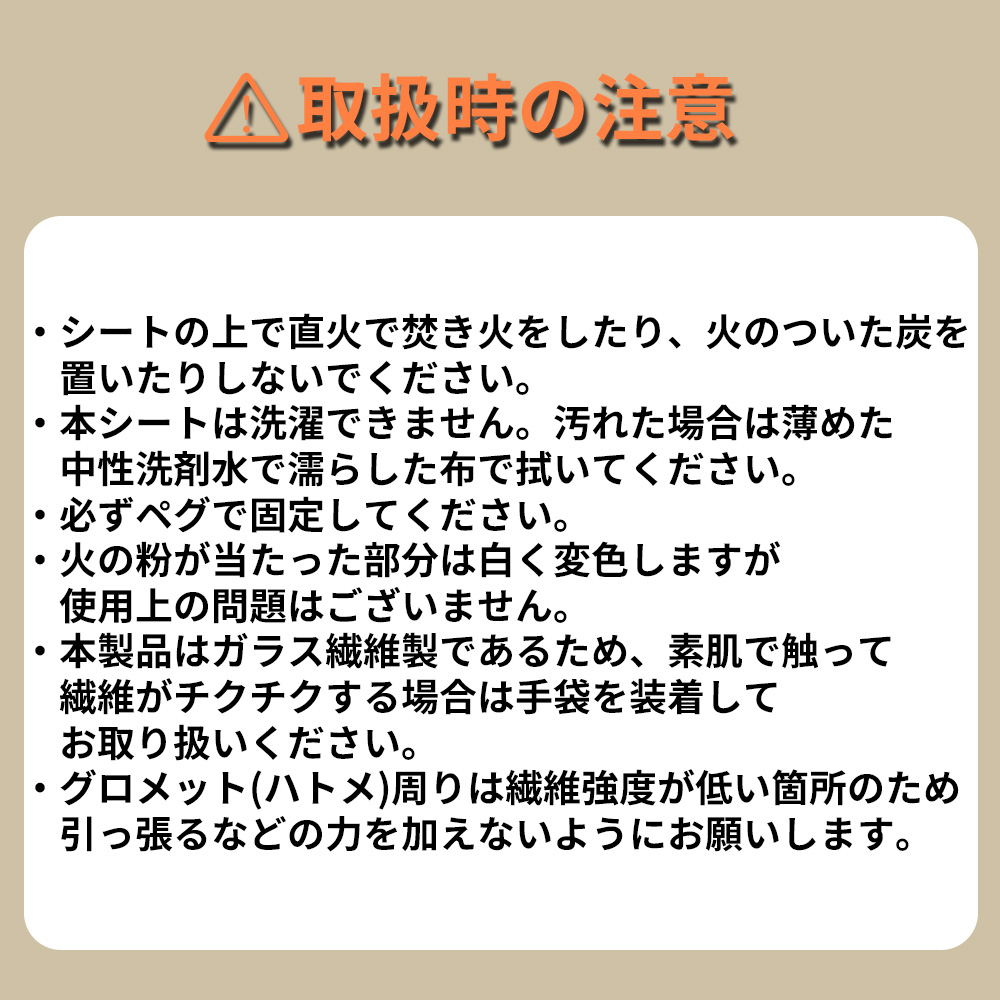 ●熱に強い難燃性素材 ●優れた耐熱・耐久性 ●汚れに強い撥水性 ●特殊加工による滑らかな手触り ●柔らかい生地でコンパクト収納可 ●ペグダウン用ハトメ使用