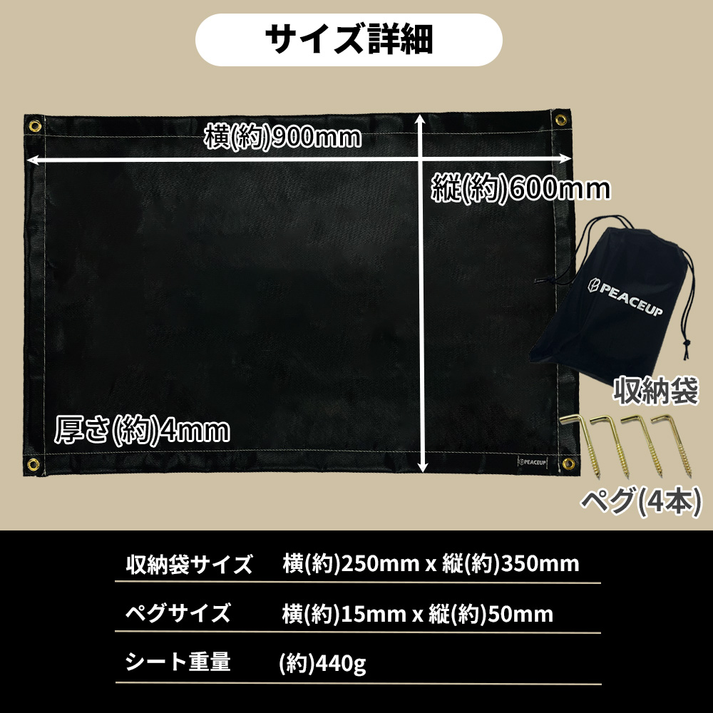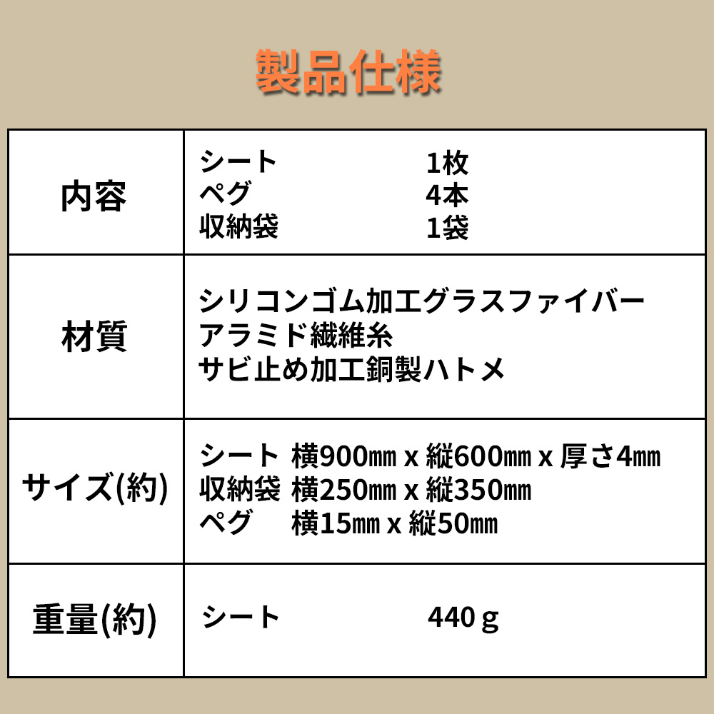 ■内容 ・シート:1枚 ・ペグ:4本 ・収納袋:1枚 ■材質 ・シリコンゴム加工グラスファイバー ・アラミド繊維糸 ・サビ止め加工銅製ハトメ ■サイズ ・本体(約):横900mm x 縦600mm x 厚さ4mm ・収納袋(約):横250mm x 縦350mm ・ペグ(約):横15mm x 縦50mm ■重量 ・シート(約):440g