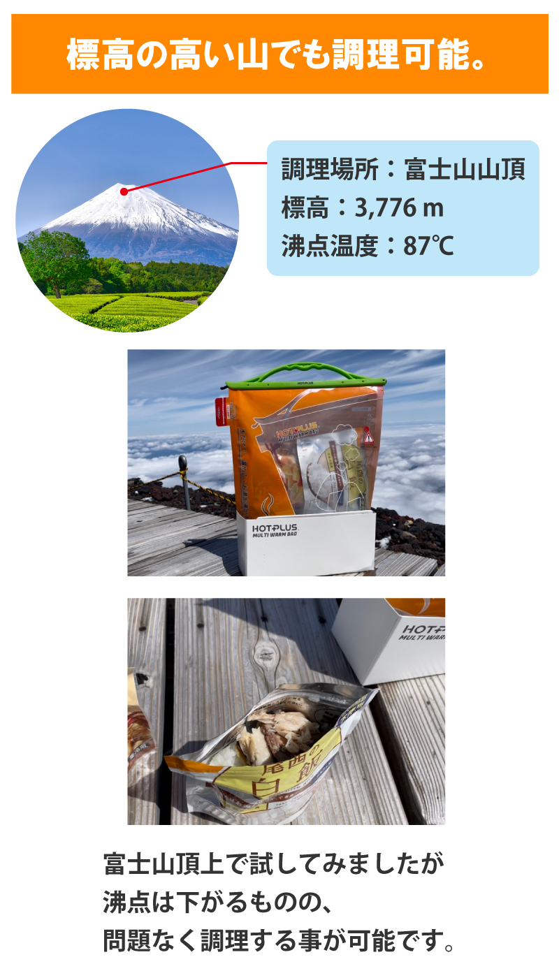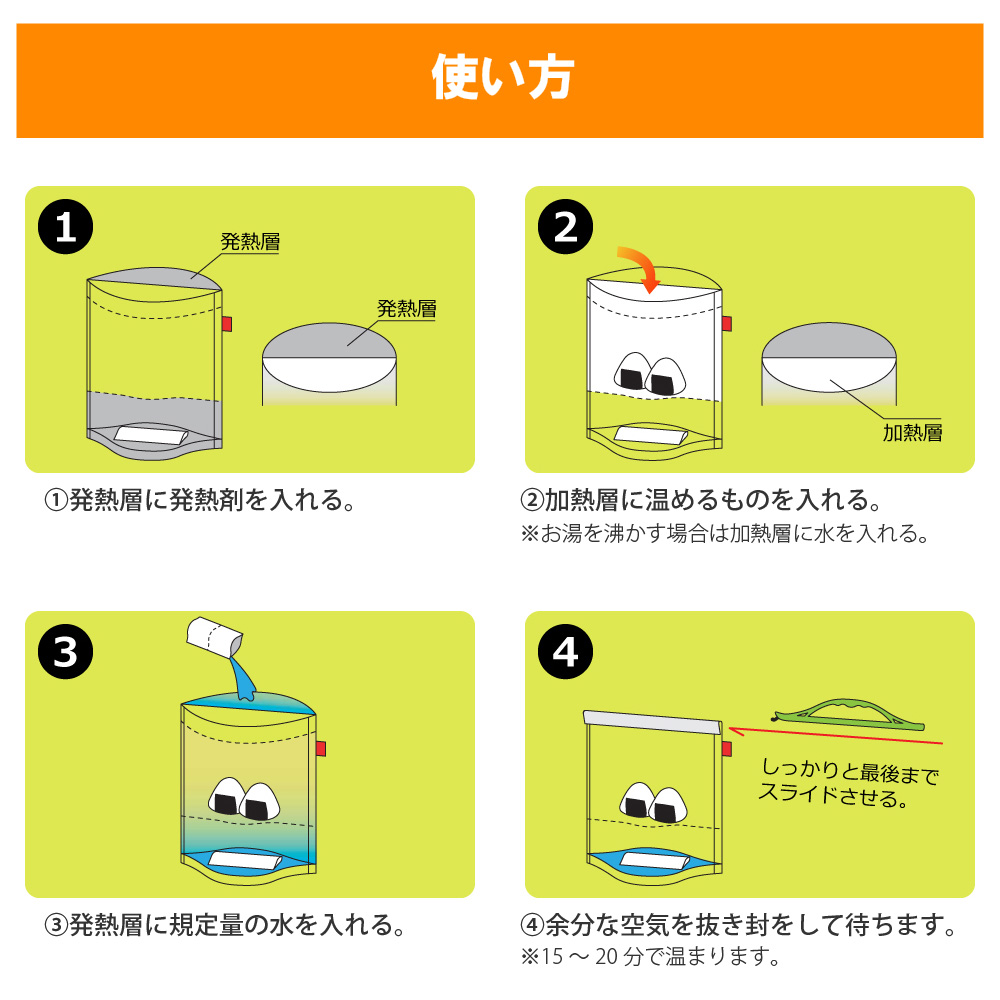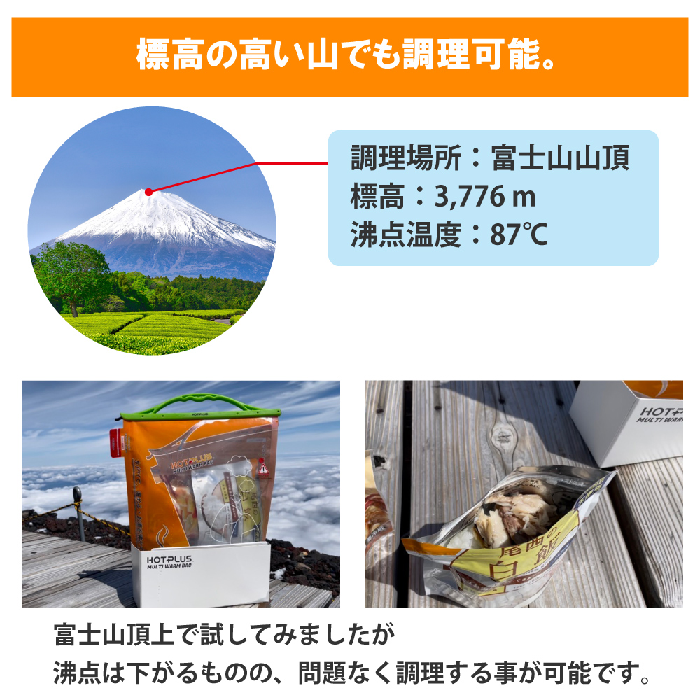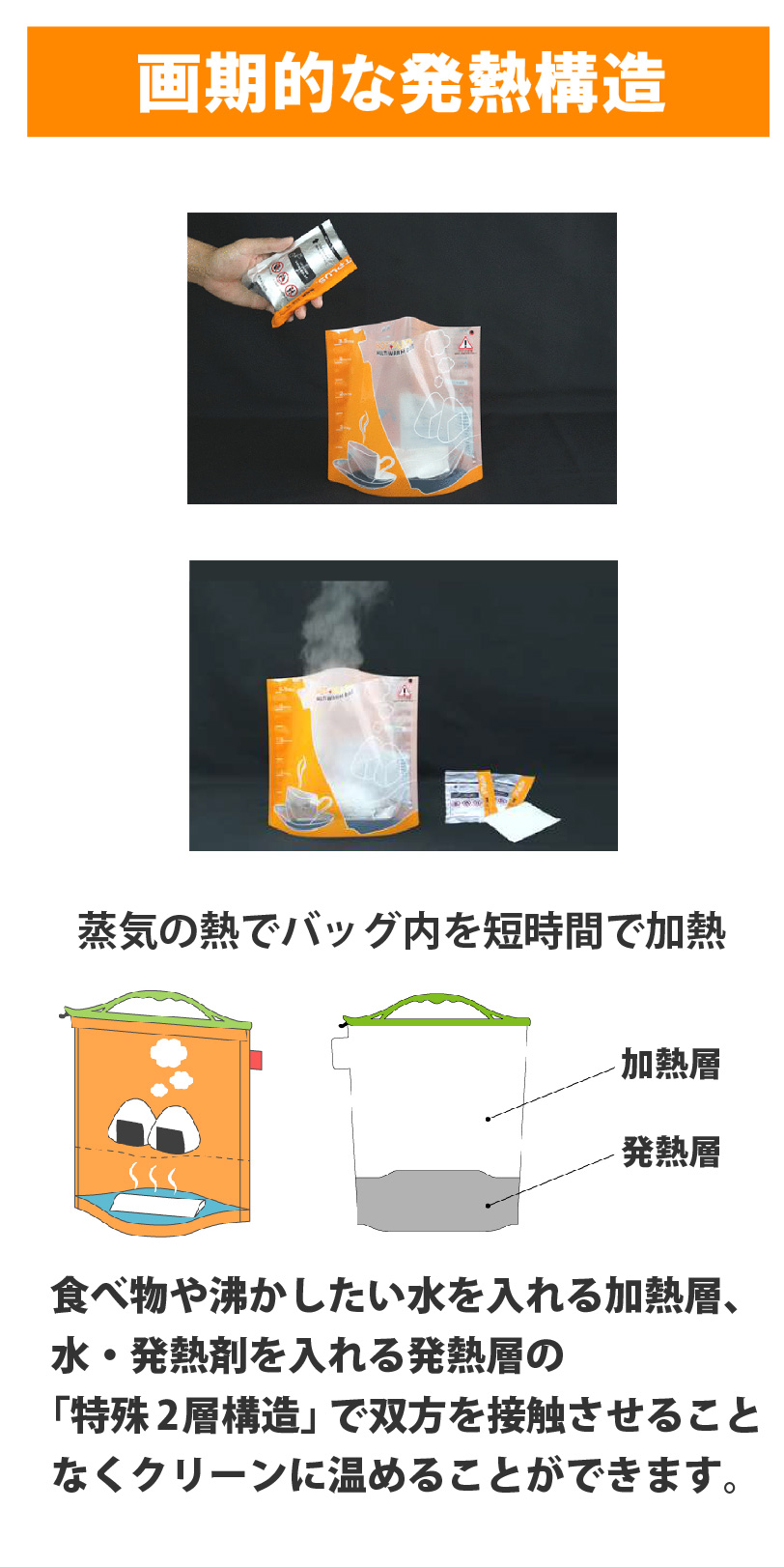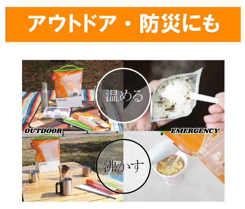 ガス・電気不要!水を入れるだけで、どこでもアツアツの食事ができる「魔法のバッグ」 HOTPLUS マルチウオームバッグセット (発熱剤3個付)