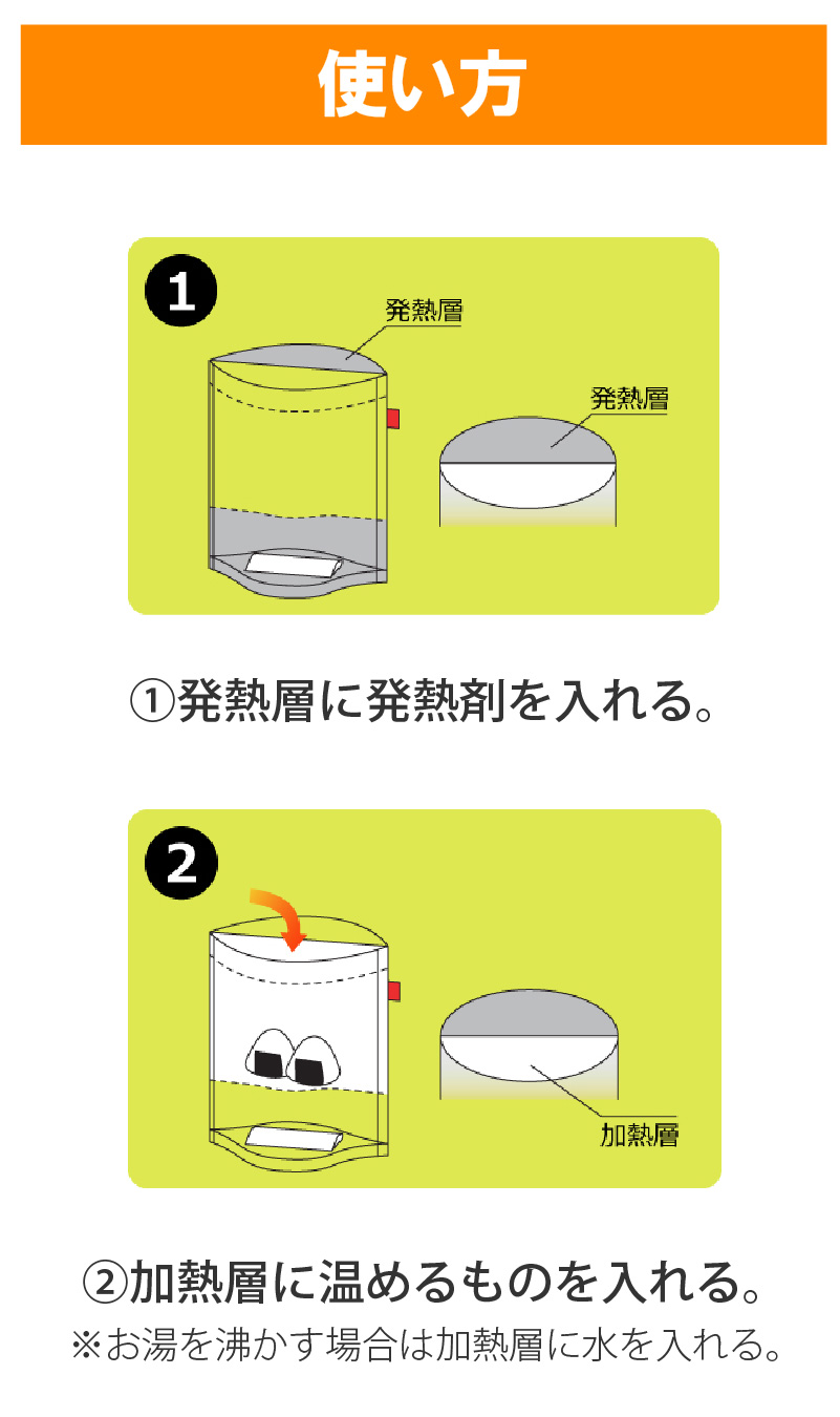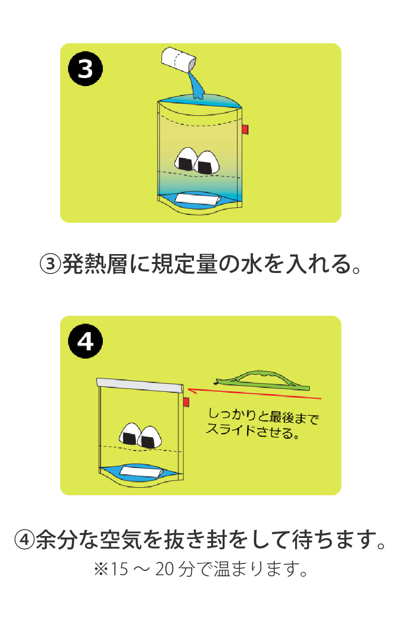 発熱剤のアルミ袋は水の計量袋として使用しますので捨てないでください。
