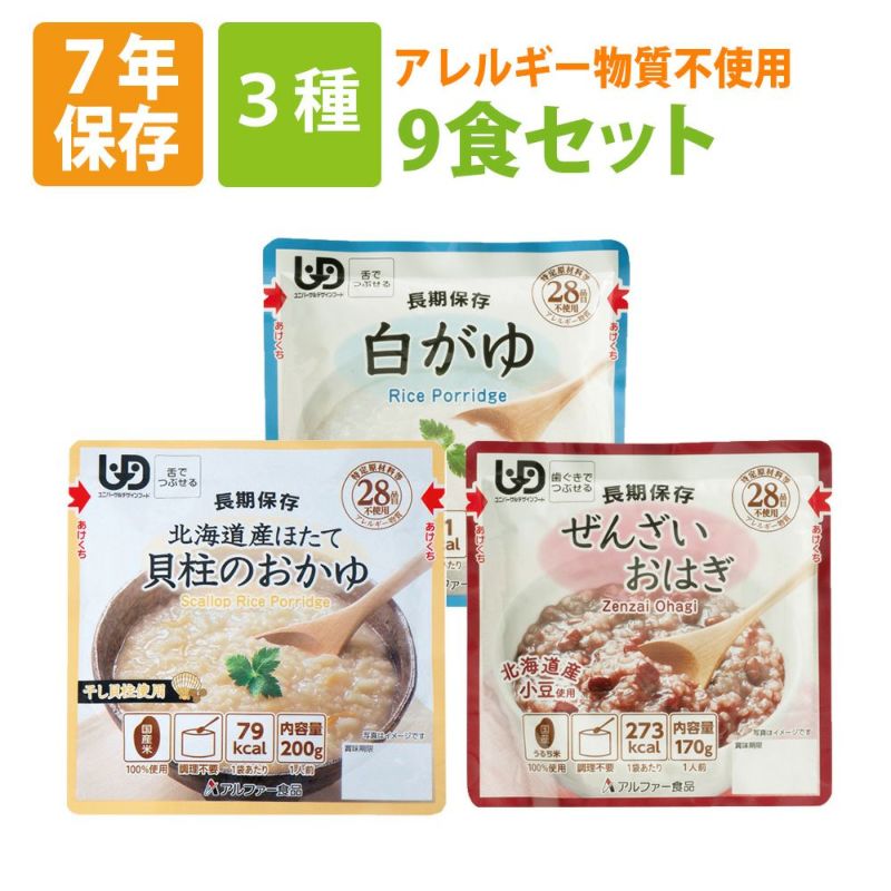 6. 非常食セット 白がゆ ほたて貝柱 ぜんざい レトルト 全3種9食セット(3種×各3)