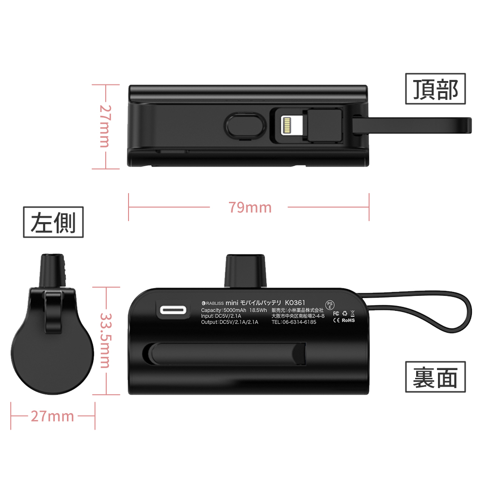 モバイルバッテリー miniモバイルバッテリ KO361 5000mAh 3色