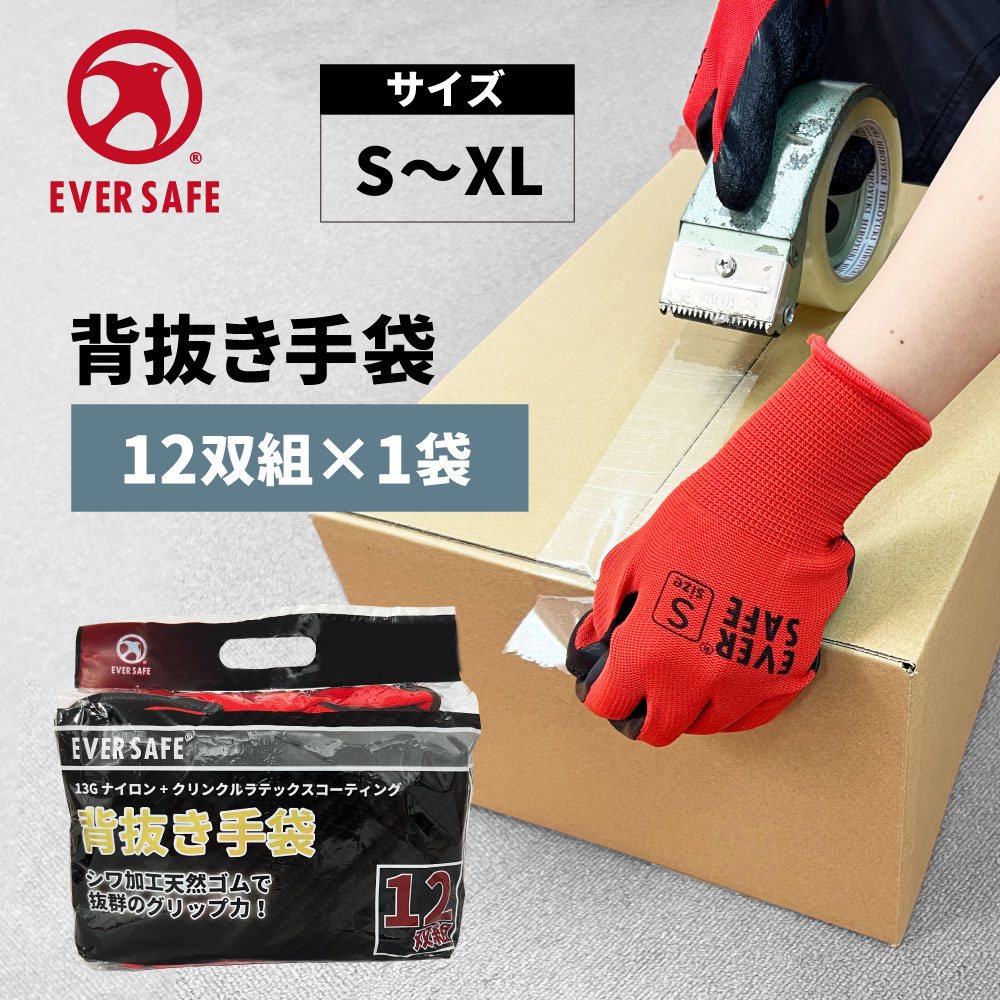 作業用手袋 背抜き手袋 12双組 1袋 S/M/L/XL レッド ESSG01 天然ゴム 滑り止め ラテックスコーティング クリンクル加工済 ナイロン 通気性 EVERSAFE