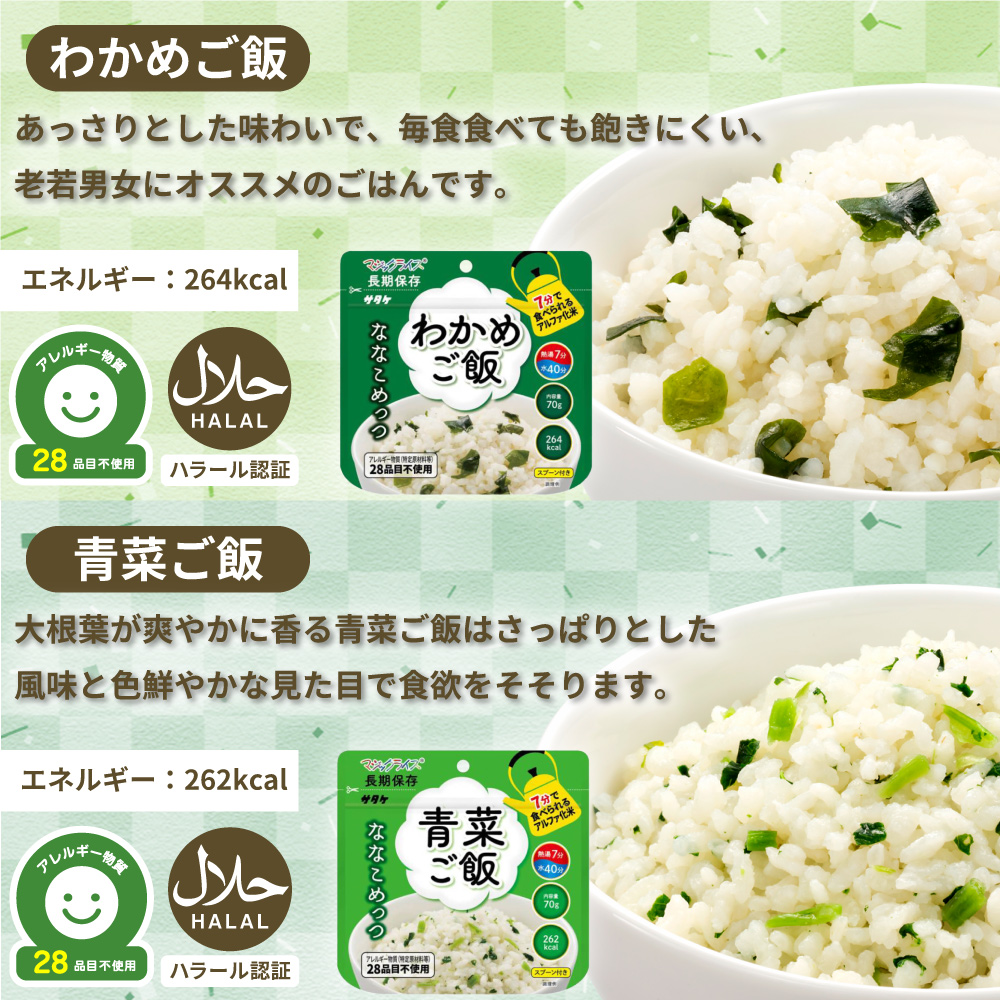 3. 非常食 ななこめっつ 6食 6種類 白飯 五目ご飯 わかめご飯 青菜ご飯 梅昆布ご飯 鯛めし アレルギー対応 7年保存 防災グッズ 防災食 28品目不使用 ごはん サタケ