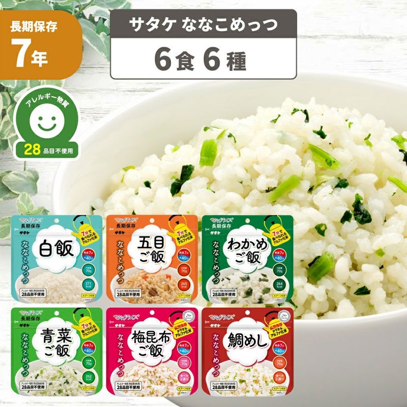 非常食 ななこめっつ 6食 6種類 白飯 五目ご飯 わかめご飯 青菜ご飯 梅昆布ご飯 鯛めし アレルギー対応 7年保存 防災グッズ 防災食 28品目不使用 ごはん サタケ