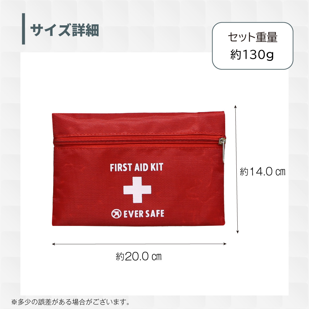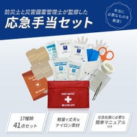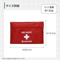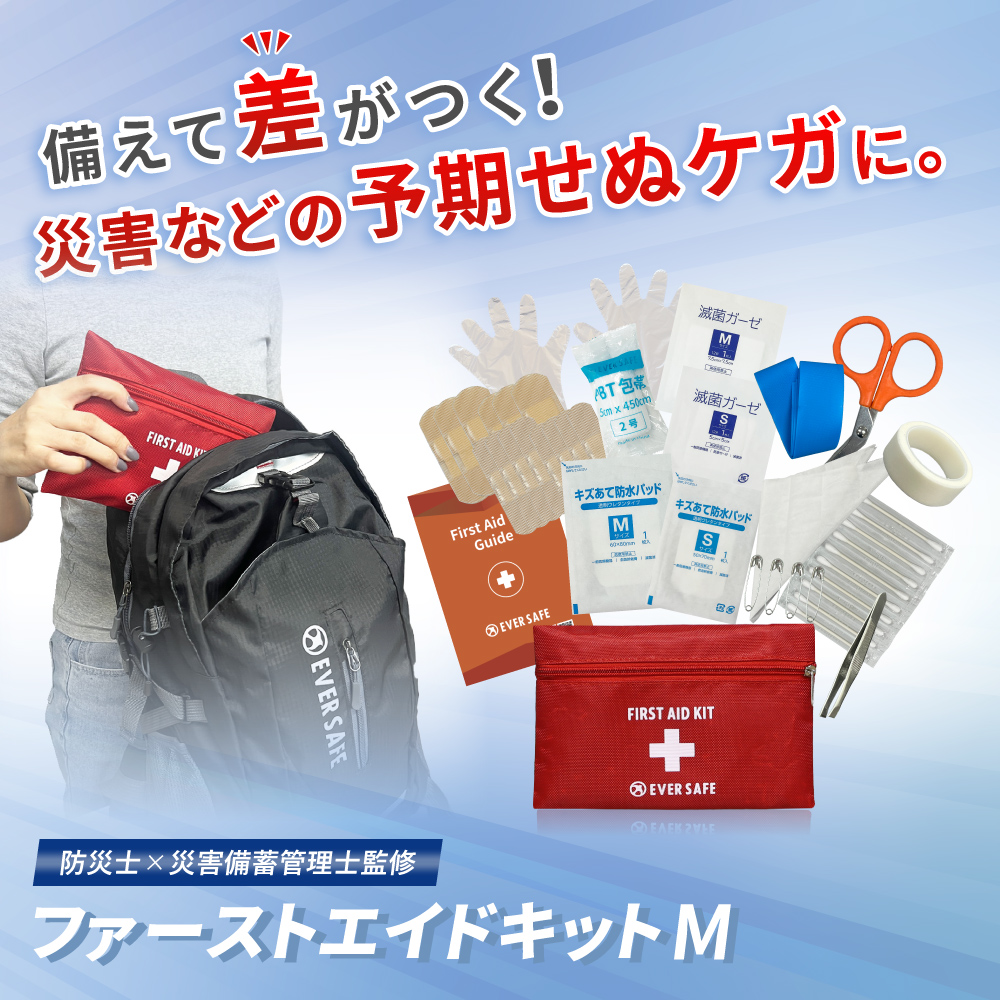 【防災士×災害備蓄管理士監修】 災害時やアウトドア、スポーツなど、いたるところに危険は潜んでいます。ですが、ご自身でひとつひとつ揃えるのは面倒で手間もかかりますよね。 そんなお悩みを解消するため、本当に必要なアイテムを厳選したファーストエイドキットを作りました。 摩耗や摩擦に強いナイロンポーチにすべて収納しているので、すぐに持ち出せます。 また 簡単マニュアルもついているので、いざというときにも冷静に手当が可能です。 家庭用はもちろん、デイキャンプや通勤、学校、スポーツにもぴったりのセットです。 ■セット内容品 ナイロン製ファーストエイドポーチ(Mサイズ)×1絆創膏(Mサイズ)×8絆創膏(Lサイズ)×6キズあて防水パッド(Sサイズ)×1キズあて防水パッド(Mサイズ)×1滅菌ガーゼ(Sサイズ)×1滅菌ガーゼ(Mサイズ)×1ハサミ×1ピンセット×1包帯(2号)×1不織布三角巾×1綿棒(個包装)×10ポリエチレン手袋(密封個包装)×1不織布テープ×1安全ピン×4止血帯(ゴム)×1ファーストエイドキットガイド×1