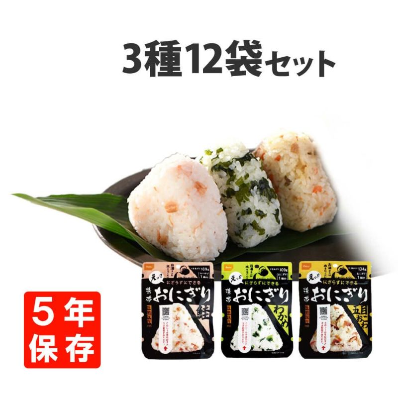 軽量、コンパクト、携帯性抜群。手を汚さずに作って食べることが出来、衛生的です。100%国産米使用 尾西の携帯おにぎり「3種類 12袋セット」 わかめ・鮭・五目おこわx各4袋