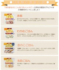 アルファ米にはさまざまな種類があり、白飯・白粥などから松茸・パエリア風・えびピラフなどさまざまな味があります。