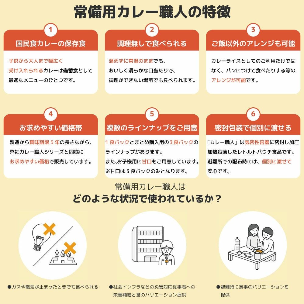 他の画像を見る 多くの方に受け入れられる“国民食”カレーの保存食 [5年保存][常温食可]常備用カレー職人 9食セット 辛さが選べる (甘口/中辛)いずれか1種 公式サイト特別価格 ¥ 1,689 税込 詳細を見る お気に入りに登録する