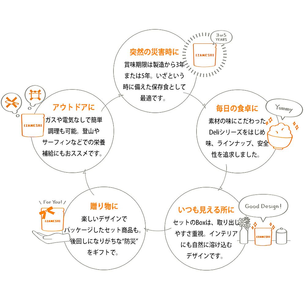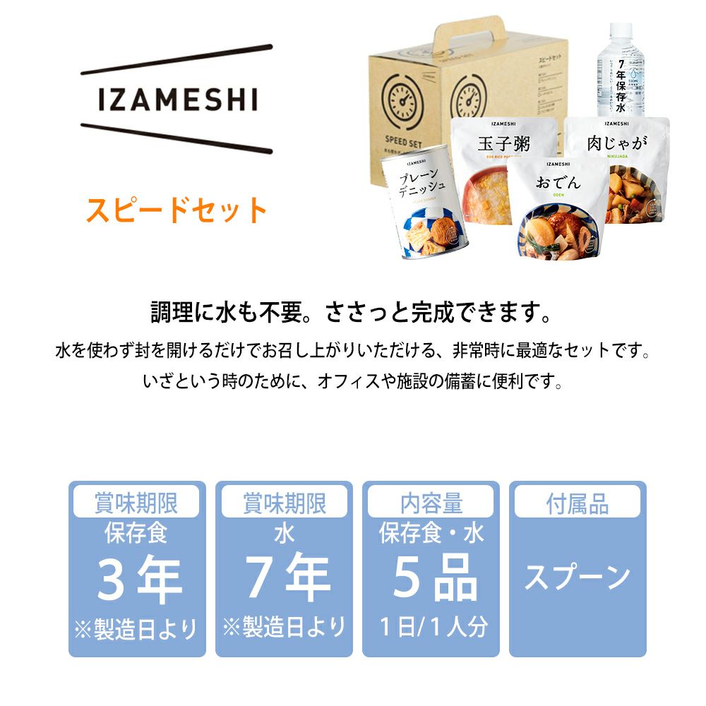他の画像を見る 調理不要 水を使わず封を開けるだけの非常食セット。3年保存。ギフト・贈り物・プレゼントにも最適!ローリングストックとしても。 非常食セット スピードセット 1セット 1日分 IZAMESHI(イザメシ) 防災グッズ 3年保存 防災食 保存食セット 保存料ゼロ お米 ご飯 公式サイト販売価格 ¥ 2,565 税込 在庫切れ 詳細を見る お気に入りに登録する