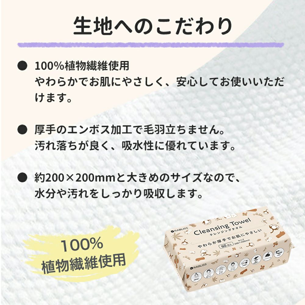 他の画像を見る やわらか厚手でお肌にやさしい、100%植物繊維使用 使い捨てクレンジングタオル 240枚入(60枚入×4個) KO295 RABLISS 公式サイト特別価格 ¥ 1,881 税込 在庫切れ 詳細を見る お気に入りに登録する