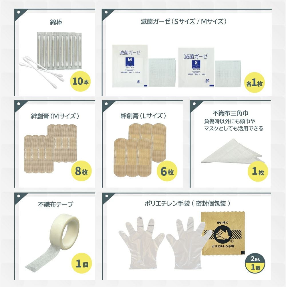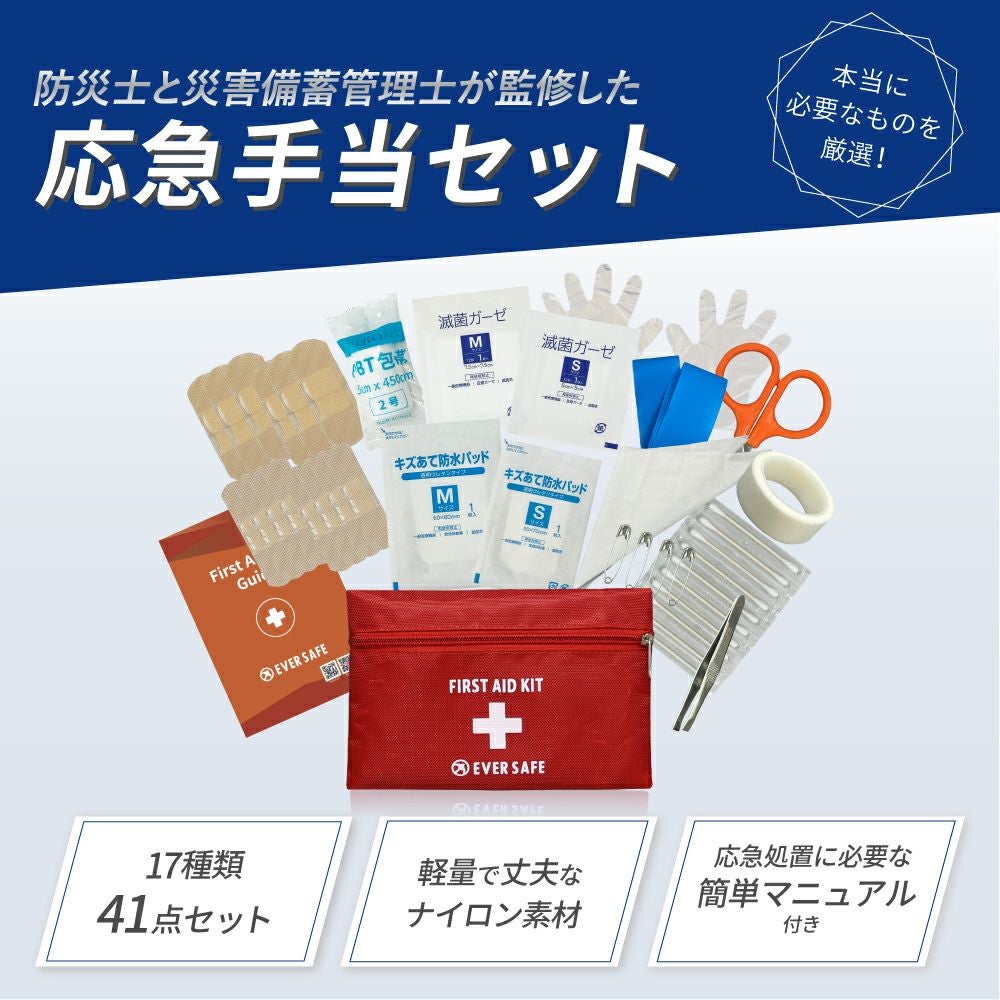 他の画像を見る 災害時やアウトドア、スポーツなどでの予期せぬケガに。ガイドブック付きで緊急時も安心。 ファーストエイドキット Mサイズ 救急セット 救急箱 防災グッズ 防災士監修 応急処置 キャンプ アウトドア 登山 車載 EVERSAFE FANYM01 メール便1個まで 公式サイト特別価格 ¥ 1,796 税込 詳細を見る お気に入りに登録する