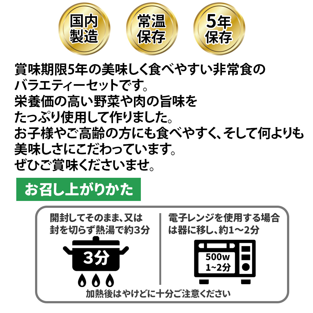 災害にあった際の非常食として長期保存や備蓄ができるご飯や食料食品のセットです。地震対策やサバイバル用としておすすめします。 保存食は進化し、今では幅広いニーズに応えられるようになっています。災害時にも普段食べ慣れた美味しい食事を摂ることができます。 保存食といえばなにを思い浮かべるでしょうか。乾パンや魚の缶詰、レトルトカレーやインスタントラーメンなどではないでしょうか? 今の保存食は、柔らかなごはんやパン、スープやハンバーグなど多種多様な種類、味が取り揃えられており、幅広いニーズに応えられるようになっていて、災害時にも食べ慣れた美味しい食事を摂ることができます。 アルファ米の『アルファ』とは、お米に含まれる「デンプンの状態」を示しています。お米は70~80%がデンプンでできています。生デンプン(生米)は、そのまま食べてもまずく、消化しにくいため栄養になりにくいのですが、水を含ませ熱を加えると、美味しくて、しかも消化しやすいデンプンに変わります。アルファ化したご飯は水分を除く(乾燥)と、生デンプンへ戻らず「アルファ化デンプン」の状態を保ち続けます。そして、このアルファ米にお湯や水を加えると、煮炊きせずとも、軟らかく美味しいご飯ができ上る、という訳です。 アルファ米は宇宙食や南極探検隊などでも使われている「インスタントごはん」とも言えるものです。 アルファ米にはさまざまな種類があり、白飯・白粥などから松茸・パエリア風・えびピラフなどさまざまな味があります。 アレルギー要素フリーなものや肉や魚、卵などが入っていないものなどもあります。 わたしはごはんではなくパン派。そういった方は「パンの缶詰」です。 普段食べているようなやわらかいパンをそのまま缶詰にしました。カンパンより食べやすく、ふんわりとした食感が特徴です。パンの缶詰はいつでも柔らかく、しっとりとした味わいです。喉が渇かないように甘みを抑えてあり、脱酵素剤や防腐剤なども使っていません。 チョコレート&ストロベリーやココア、黒まめなど味も多様で、エッグフリーなどアレルギーに対応したものもあり、安心して食べられます。 常温でもそのまま美味しいスープやお湯を入れるだけでできたてのスープになるフリーズドライスープなどを用意しておけば、 いつでも、どんなときでも本格スープを簡単に味わうことができ、栄養と水分を同時に摂取、心も身体も温めることができます。 100kcal以下、食塩相当量1g以下!しかも化学調味料無添加のものなど、健康が気になるかたでも安心して飲むことができます。 ハンバーグやさばの味噌煮、牛丼、肉じゃがまで日常のおかずも保存食に!!冷凍の必要がなく、常温で3~5年間保存ができ、そのままでも美味しく食べられます。キャンプなどのレジャー用など日常でも味わうことができます。 甘いものはこころを和ませてくれ、手軽にエネルギー補給が可能です。えいようかんやクッキー、ケーキの缶詰などがあります。スティックなどもあります。アレルゲンフリーのものもあります。 保存食には、アレルギーの原因となるアレルゲンフリーのものも数多く用意されています。また、組み合わせ次第ではベジタリアンの方や、子どもや年配の方にも満足できる保存食を用意することができます。 保存食は冷たくて寂しいイメージがありますが、温めることで、何倍にも美味しくなります。少量の水さえあれば、いつでも食事を暖められます。ご飯やおかずはもちろん、パンの缶詰もアツアツで美味しく食べることができます。 いざというときの備蓄だけではなく、キャンプやアウトドアのお供に、またプレゼントとしても!! 災害から支援物資が届くまでの最低3日分~7日分の水と食料を備えて置くことが推奨されています。 災害時には水や食料が店頭から売り切れるなど、物流が止まることも想定されるため、自分や家族を含めた用意をしておきましょう。
