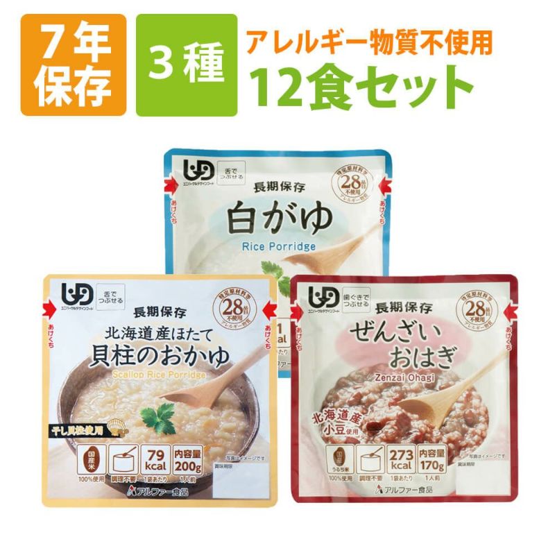 6. 非常食セット 白がゆ ほたて貝柱 ぜんざい レトルト 全3種12食セット(3種×各4)