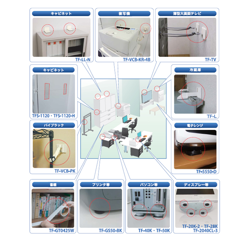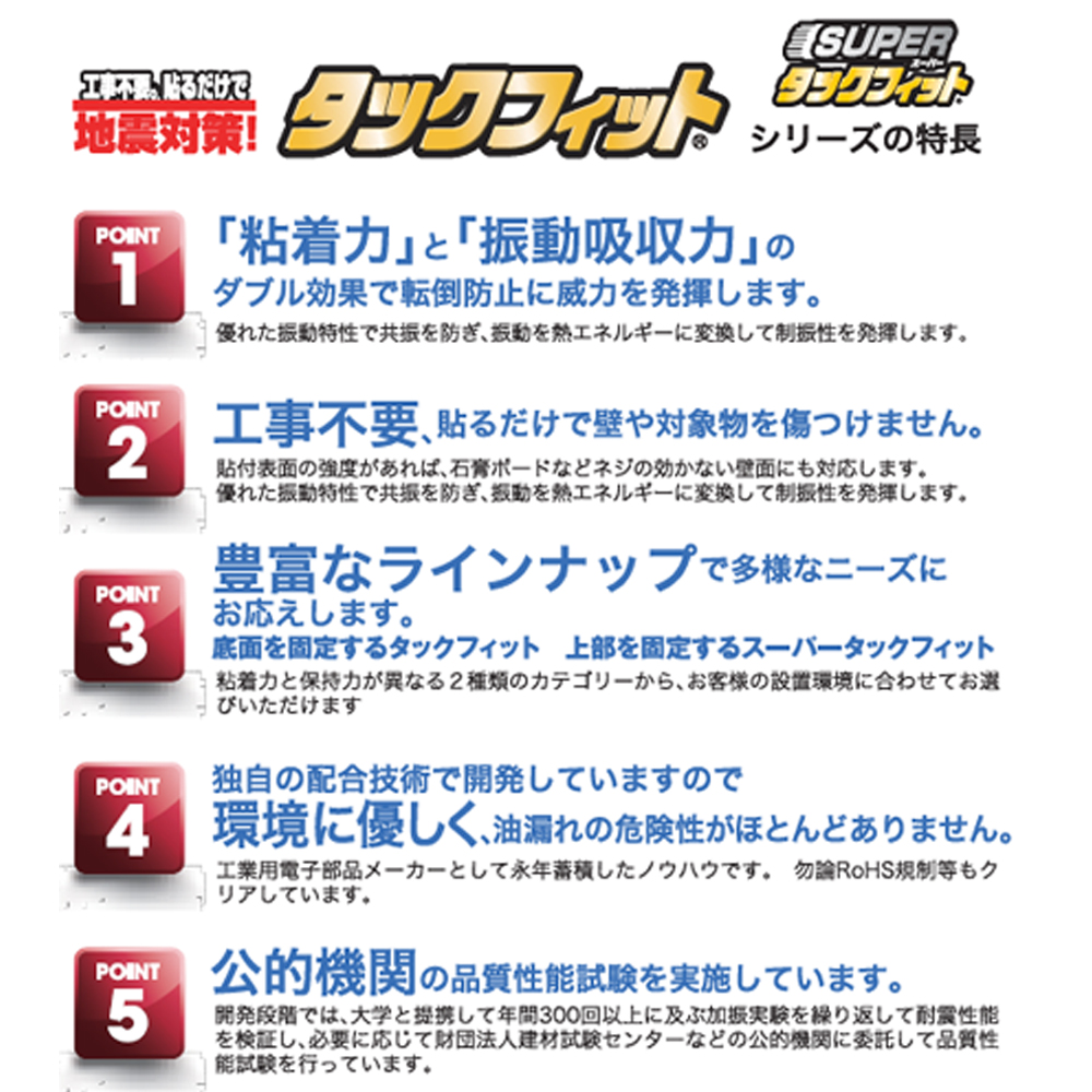 ・地震は、震度や波形、震源からの距離などによって揺れ方が大きく異なります。又、設置箇所の条件や対象物の形状・重心も千差万別ですので、大きな地震に対する 転倒予防には、本製品に加えて対象物の全面底部にタックフィットの併用もお勧めします。
